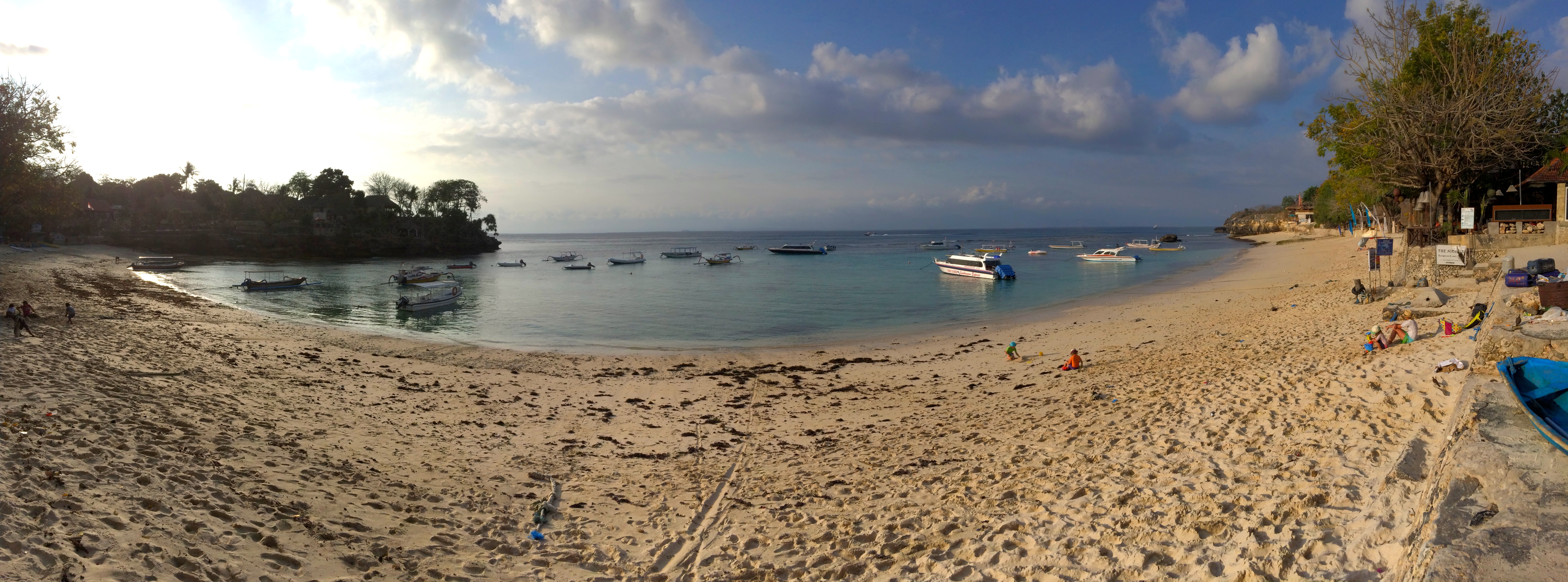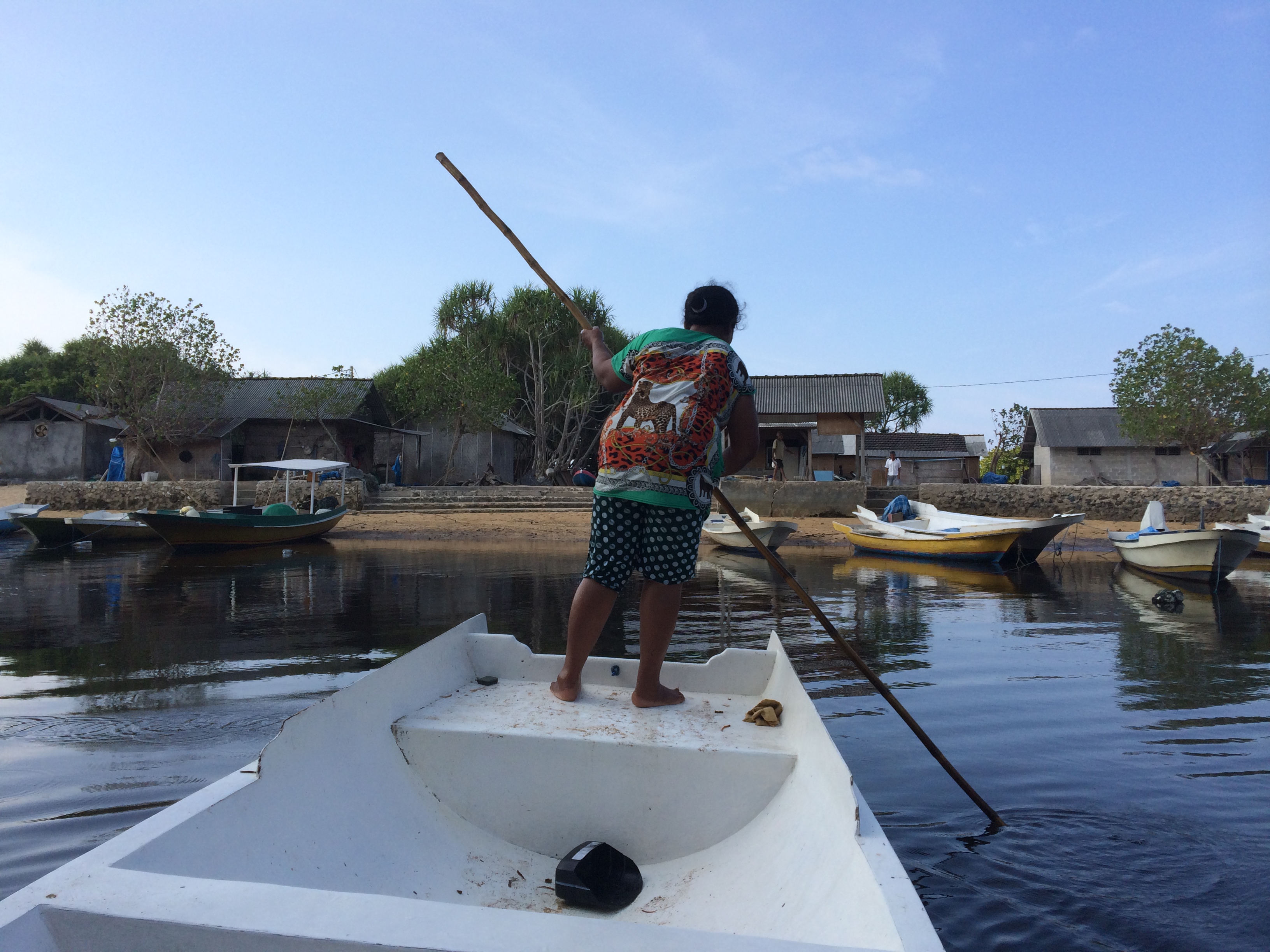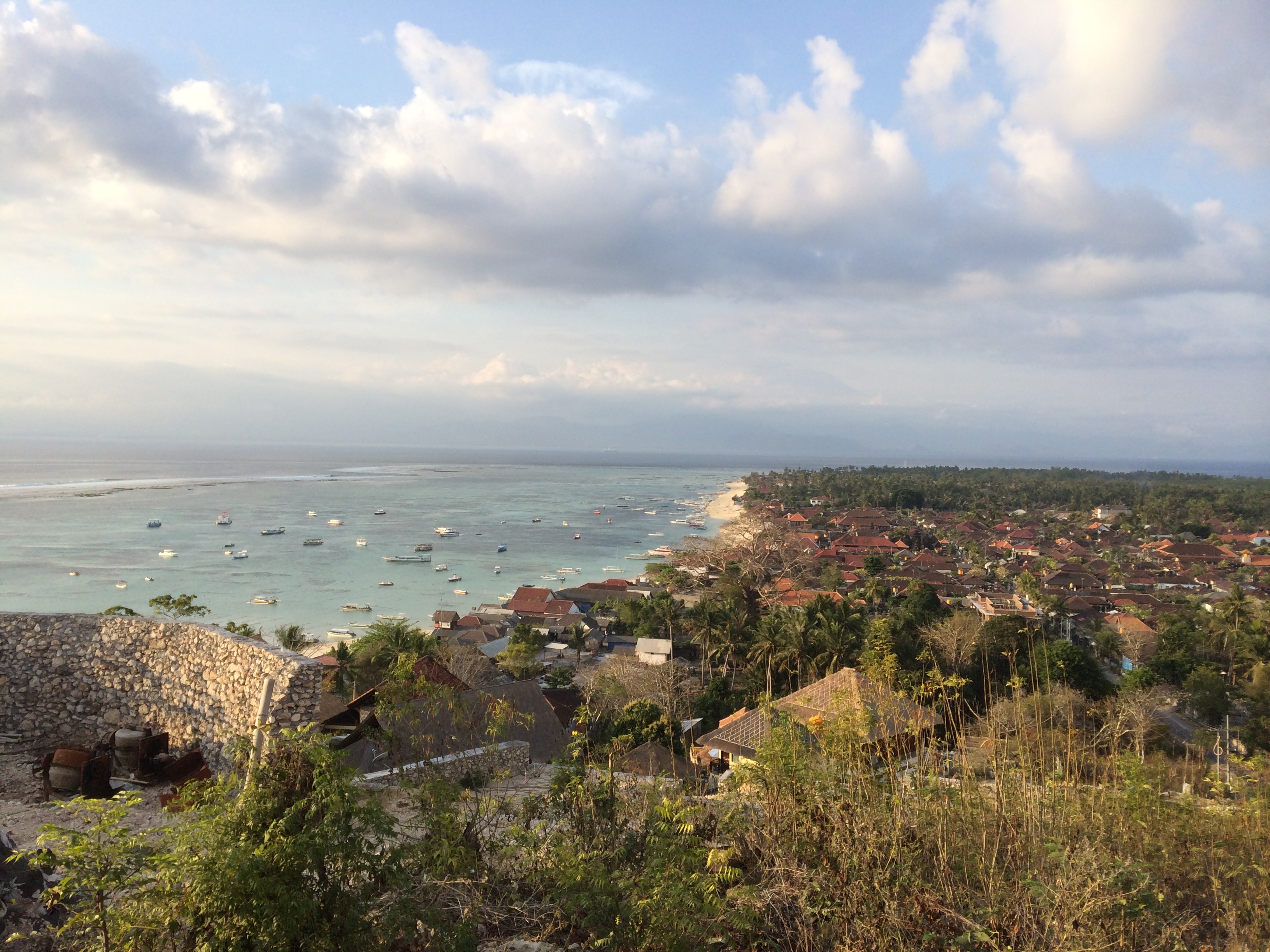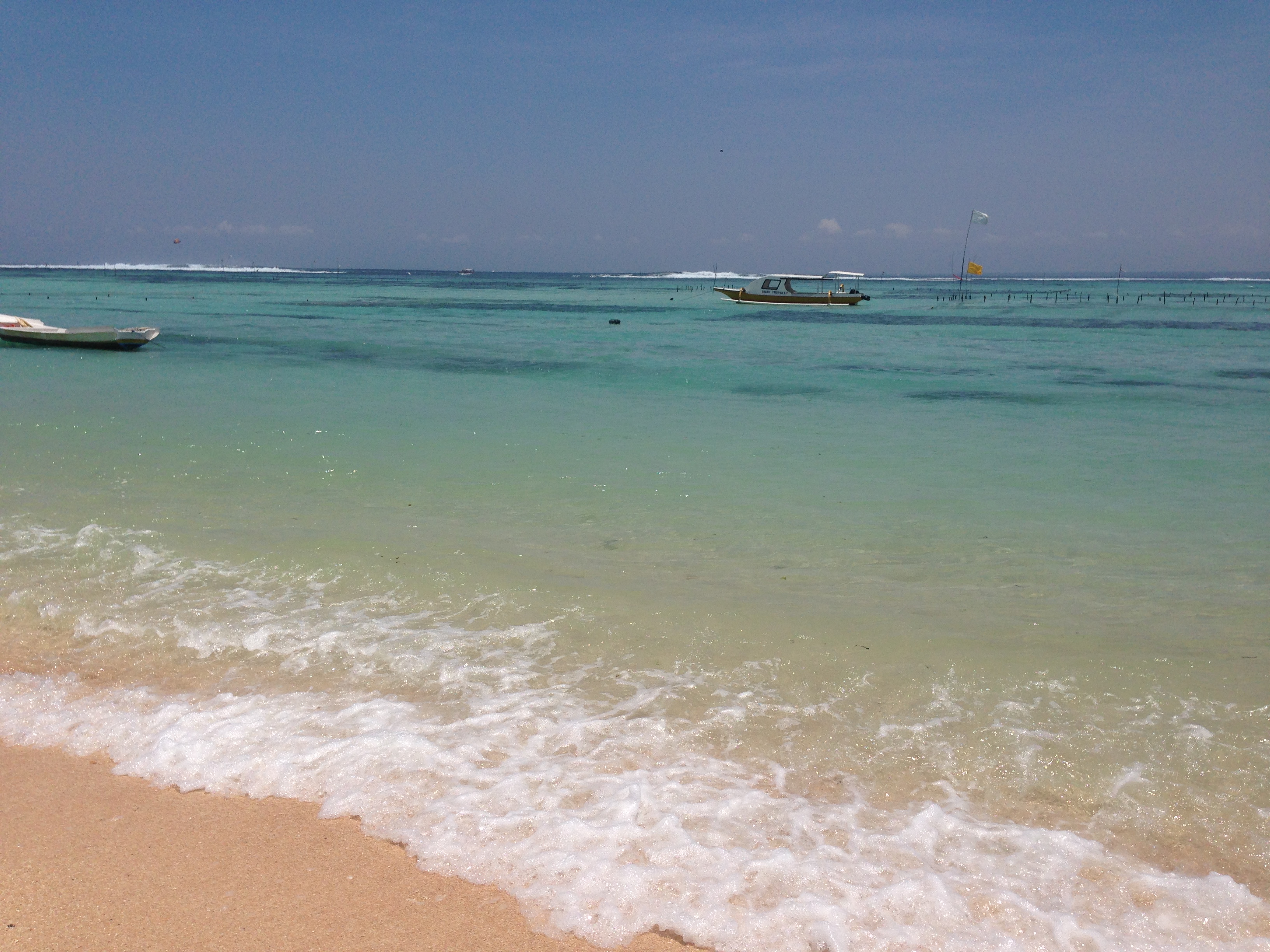Après un petit déjeuner buffet (bof) on vient nous chercher comme prévu et on nous conduit à l’embarcadère. Formalités, paiement, chargement des bagages, puis c’est à notre tour d’embarquer : on se déchausse, quelques pas dans l’eau et on grimpe dans le bateau ! Nous avons bien fait de prendre l’option « bateau rapide » vu le mal de mer de JMi à Lovina car nous arrivons 30 à 45min plus tard sur l’île sans encombre et découvrons avec joie l’île et ses eaux turquoises.