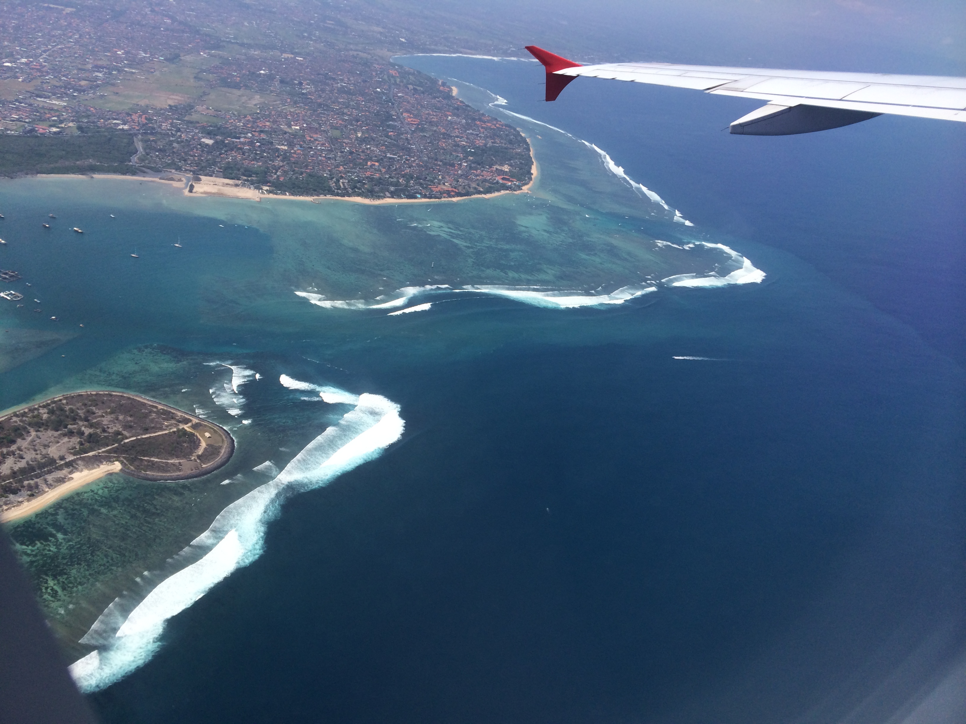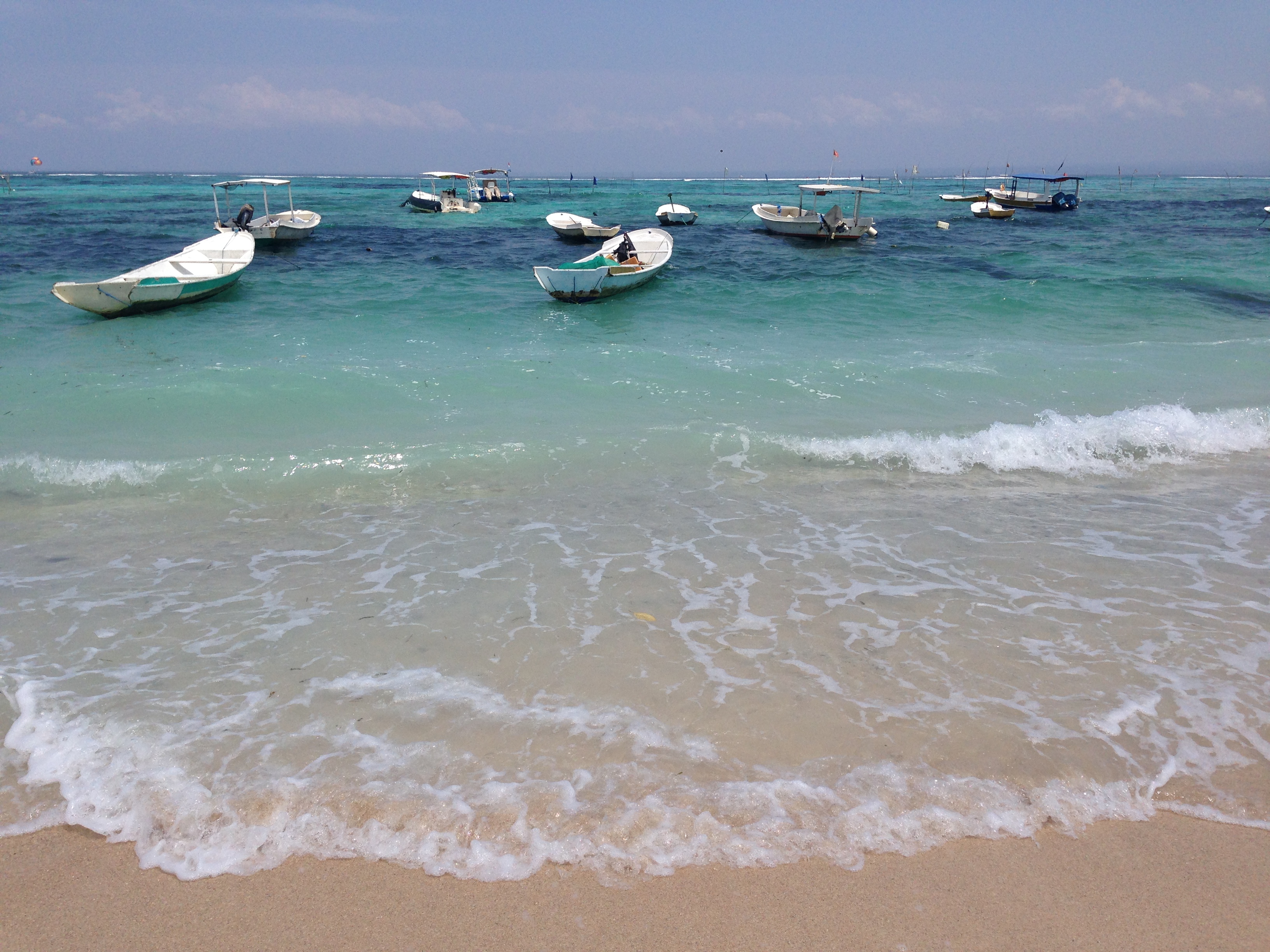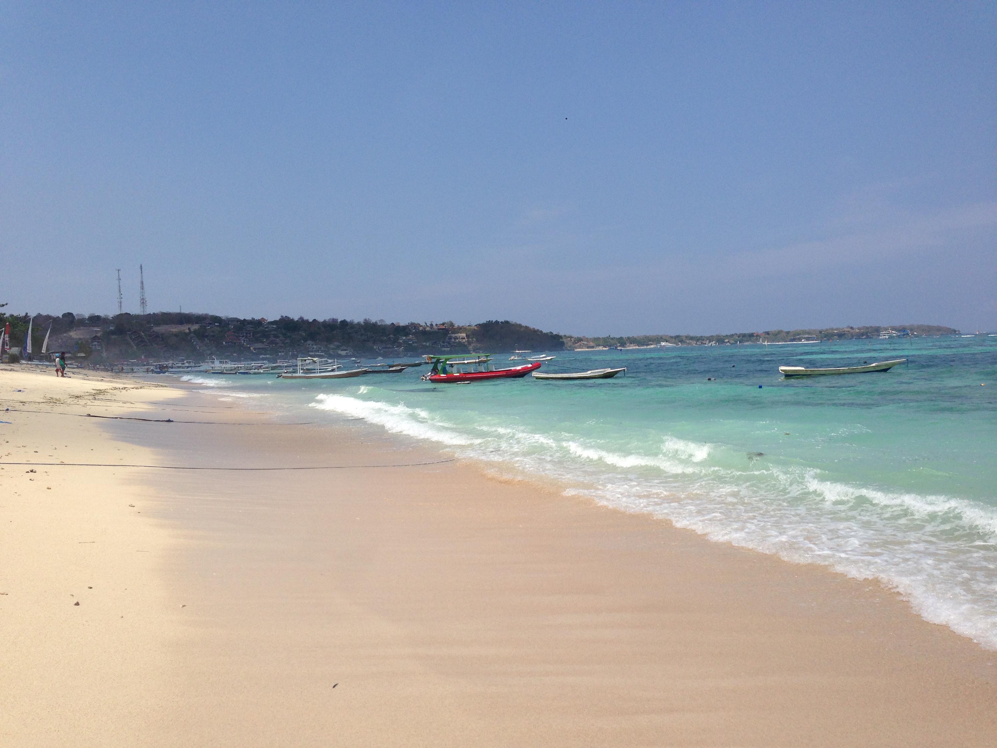 Après un petit déjeuner buffet (bof) on vient nous chercher comme prévu et on nous conduit à l’embarcadère. Formalités, paiement, chargement des bagages, puis c’est à notre tour d’embarquer : on se déchausse, quelques pas dans l’eau et on grimpe dans le bateau ! Nous avons bien fait de prendre l’option « bateau rapide » vu le mal de mer de JMi à Lovina car nous arrivons 30 à 45min plus tard sur l’île sans encombre et découvrons avec joie l’île et ses eaux turquoises.