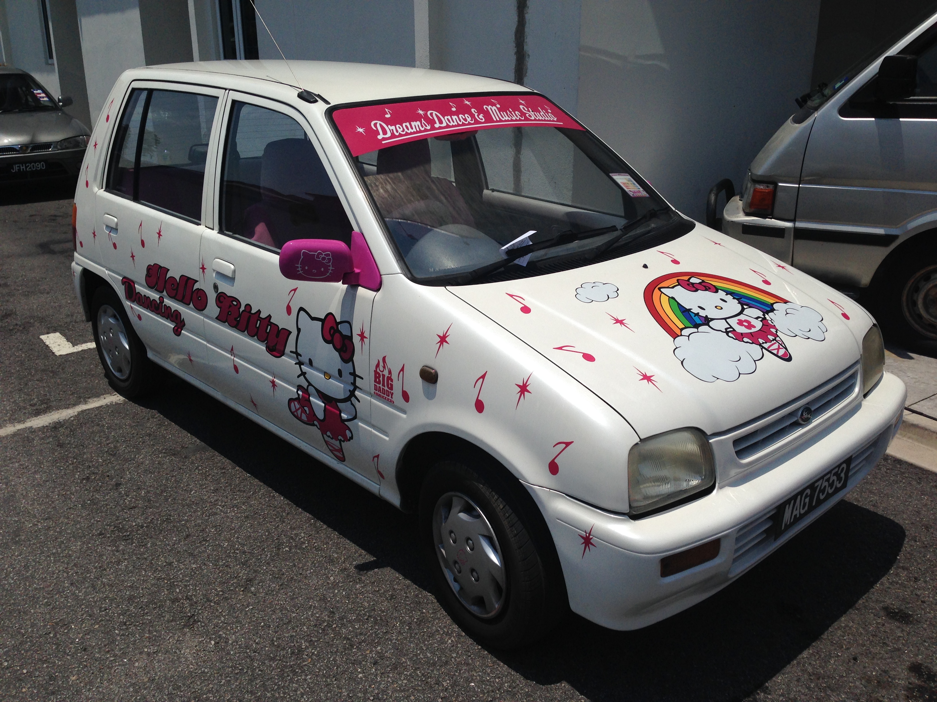 Nous sommes encore une fois en avance pour le check-in qui n’a lieu qu’à 14h30. Et il est 13h. On laisse les bagages et partons pour une petite balade exploratrice. A peine 50m parcouru, revoici le spectre de la folie Hello Kitty qui se manifeste sous la forme d’un tuning en règle d’une petite voiture citadine.