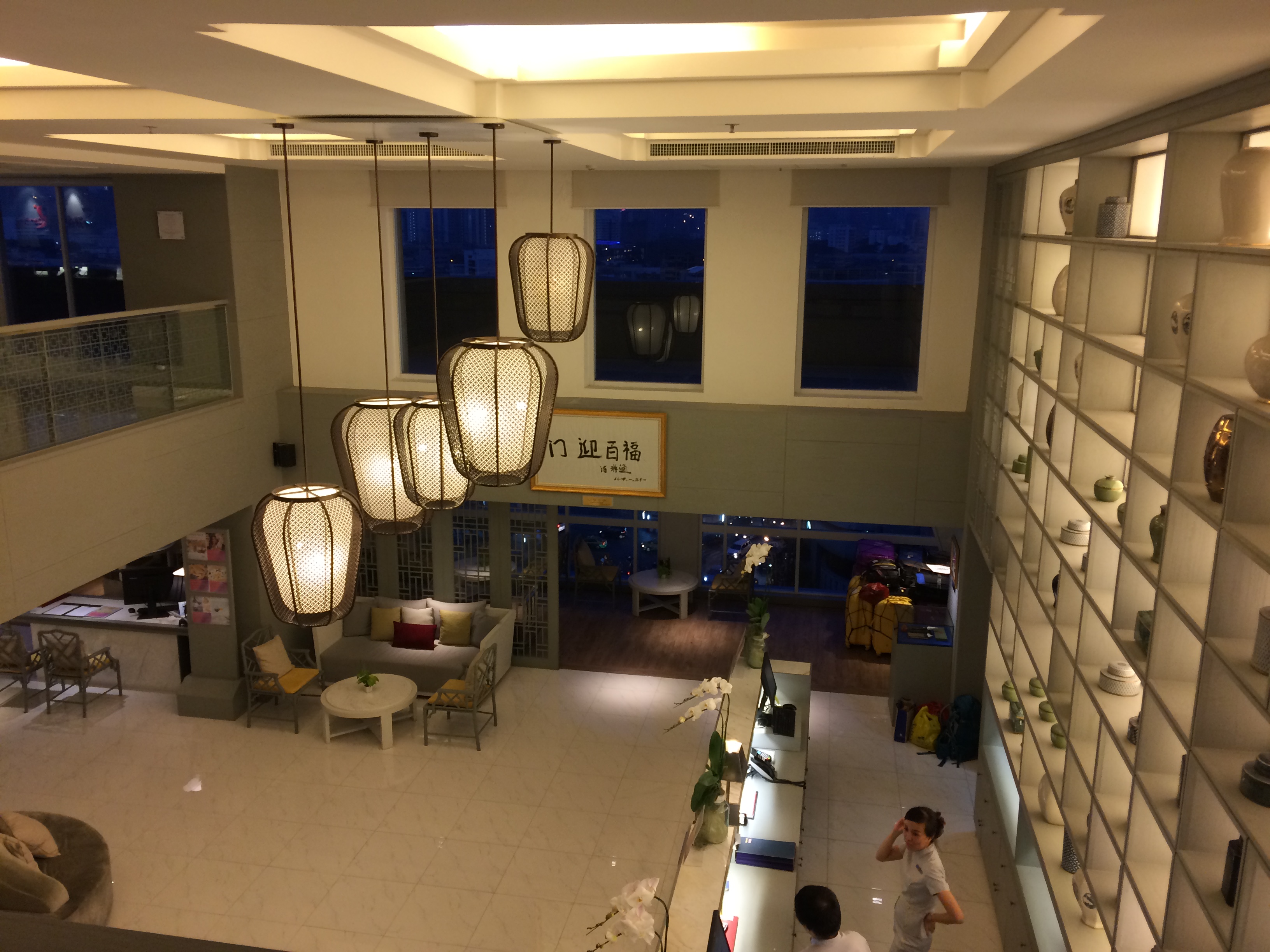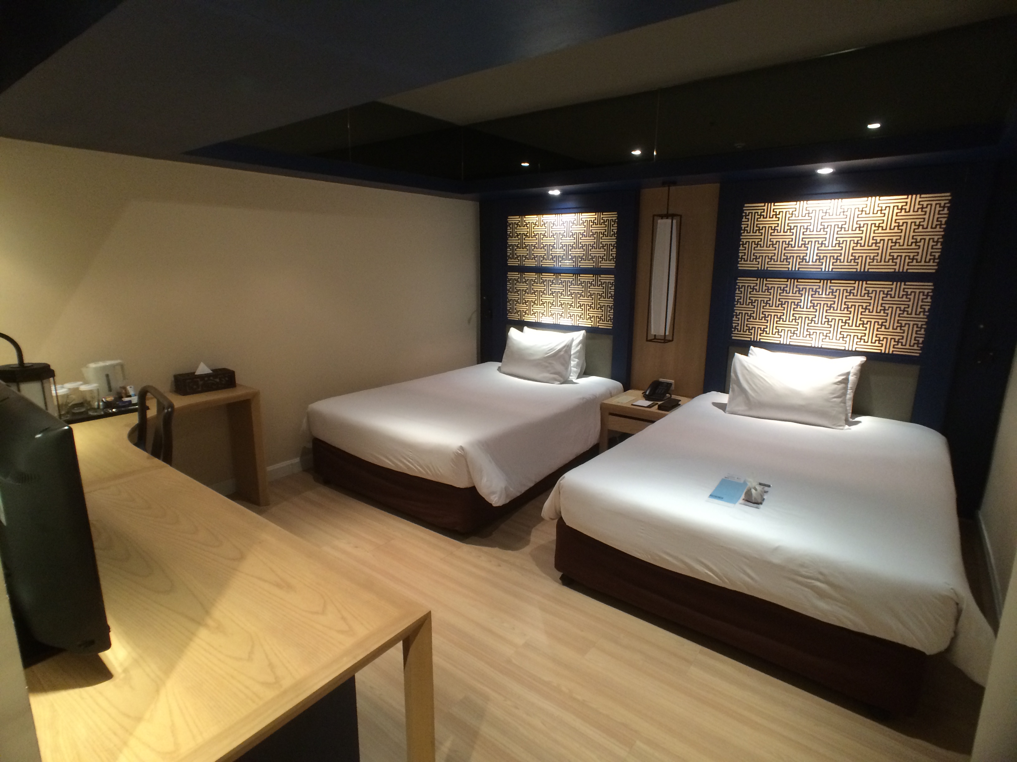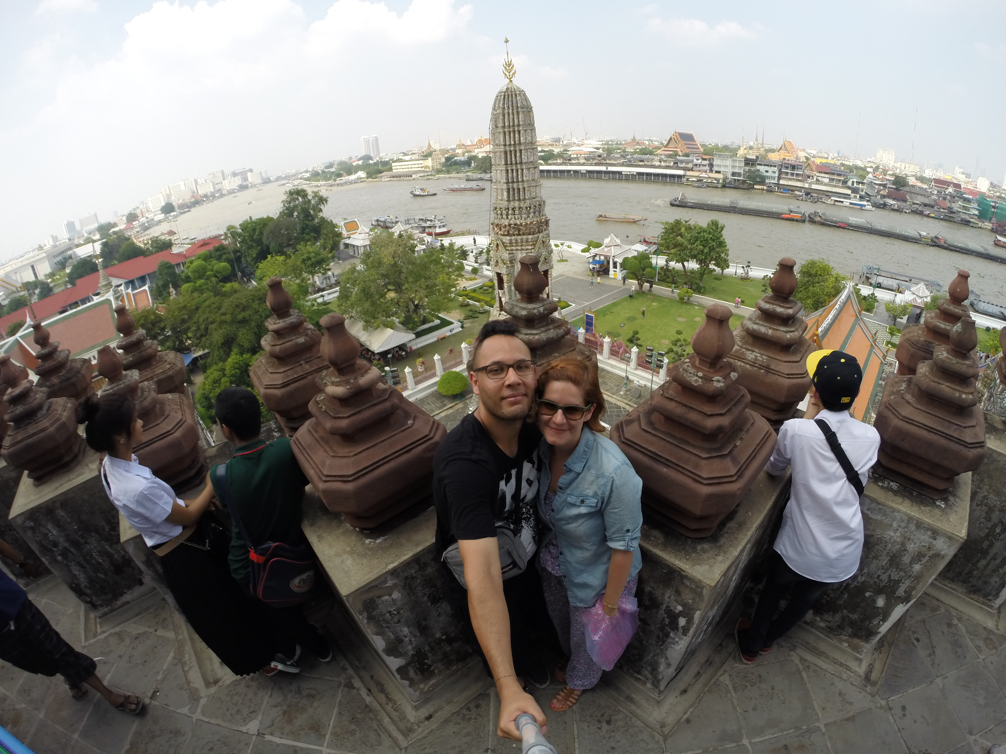 Après la visite nous cherchons l’embarcadère des bateaux bus pour rejoindre la rive d’en face et visiter le temple Wat Arun. En chemin nous trouvons un restaurant au décor très contemporain, avec la climatisation et qui sert des Pad Thaï à un prix très intéressant. Que demander de plus ? Des cocas zéro ? Ils en ont aussi ! (oui car depuis notre départ et à part à Singapour impossible d’en trouver). Nous découvrons qu’ils font aussi hôtel et visitons les chambres qui donnent sur la rivière. L’endroit est très joli mais les prix assez élevés et il est très éloigné du centre ville et des transports. Nous ne réservons donc pas pour notre prochain passage mais profitons du moment.
