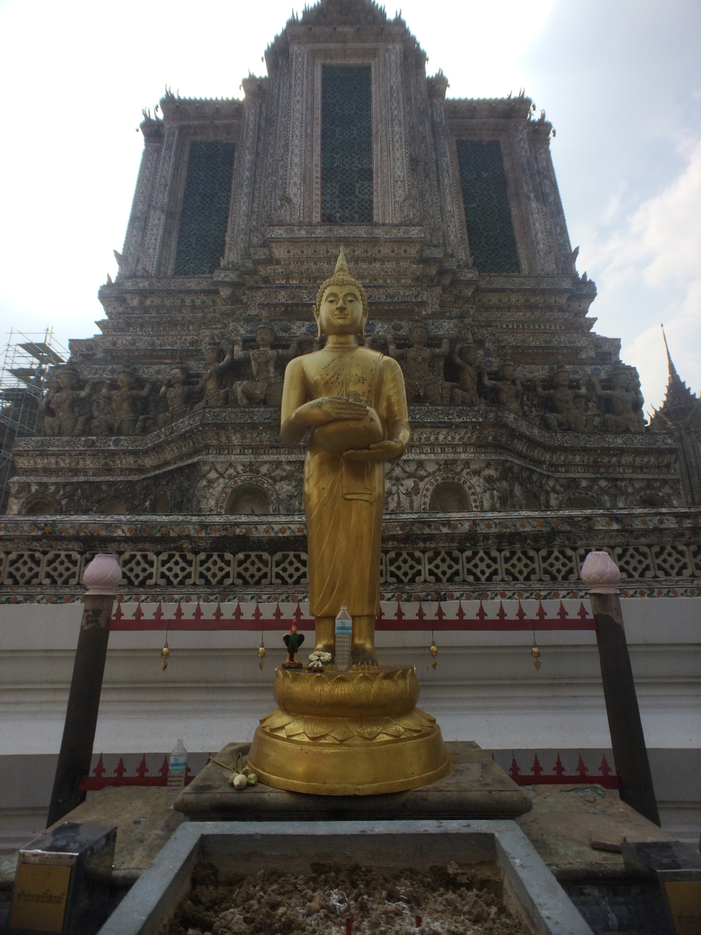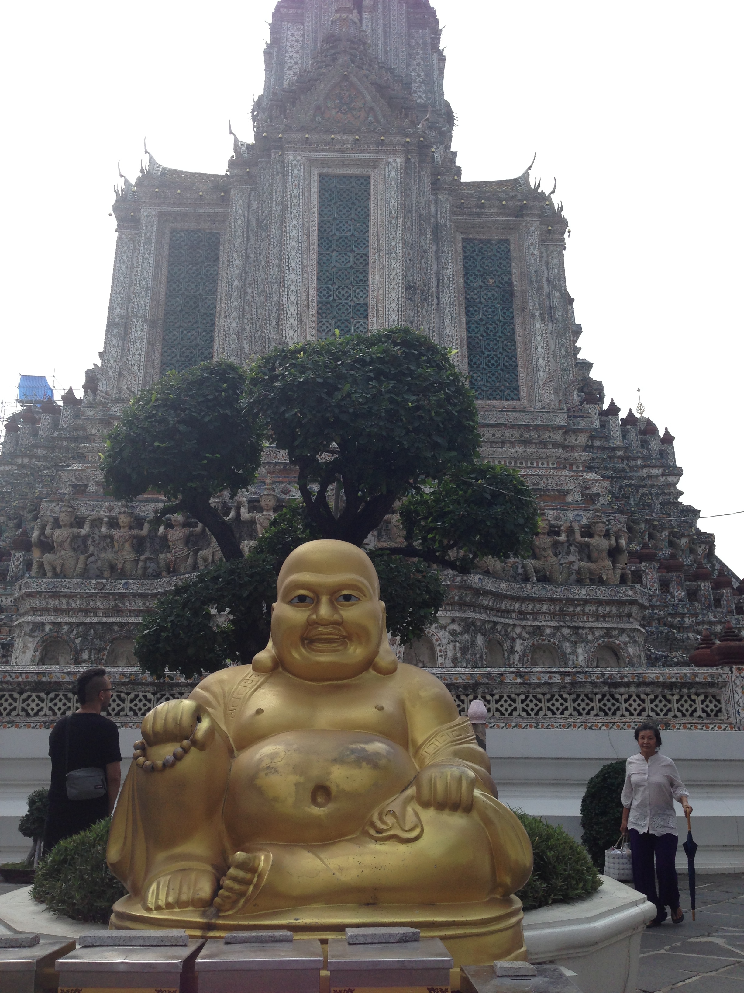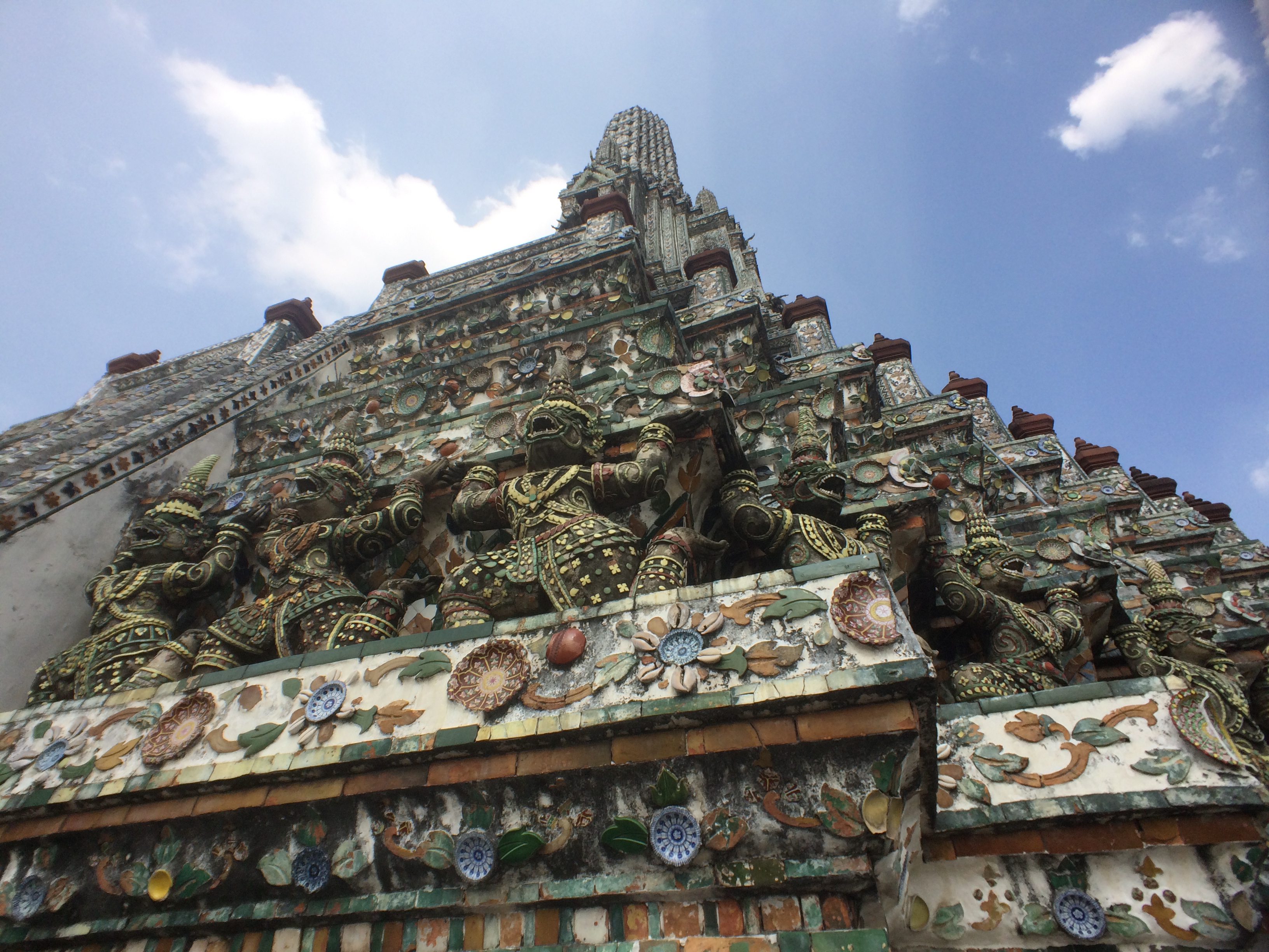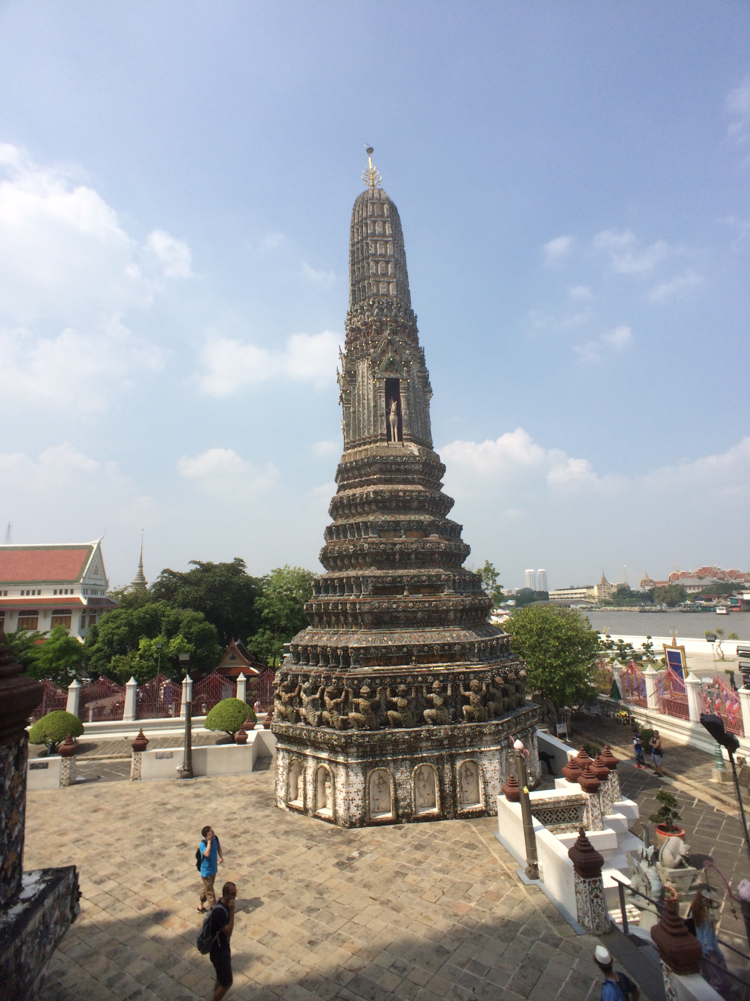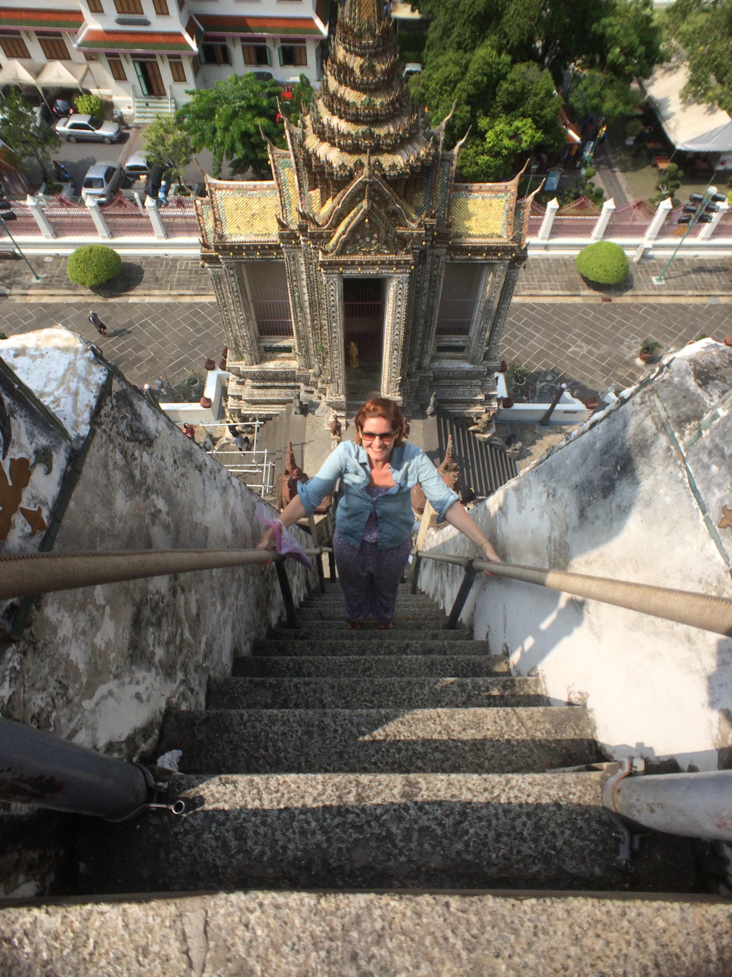 Le Wat Pho est assez impressionnant mais aussi très haut ! Après avoir tenté ( et réussi après quelques tentatives) de lancer une pièce dans le bol du Buddha situé à l’entrée nous commençons l’ascension. On y est jamais allé mais ça nous fait penser aux pyramides du Mexique tellement les marches sont hautes et abruptes (LiLi profite de la visite pour jouer à cache-cache).