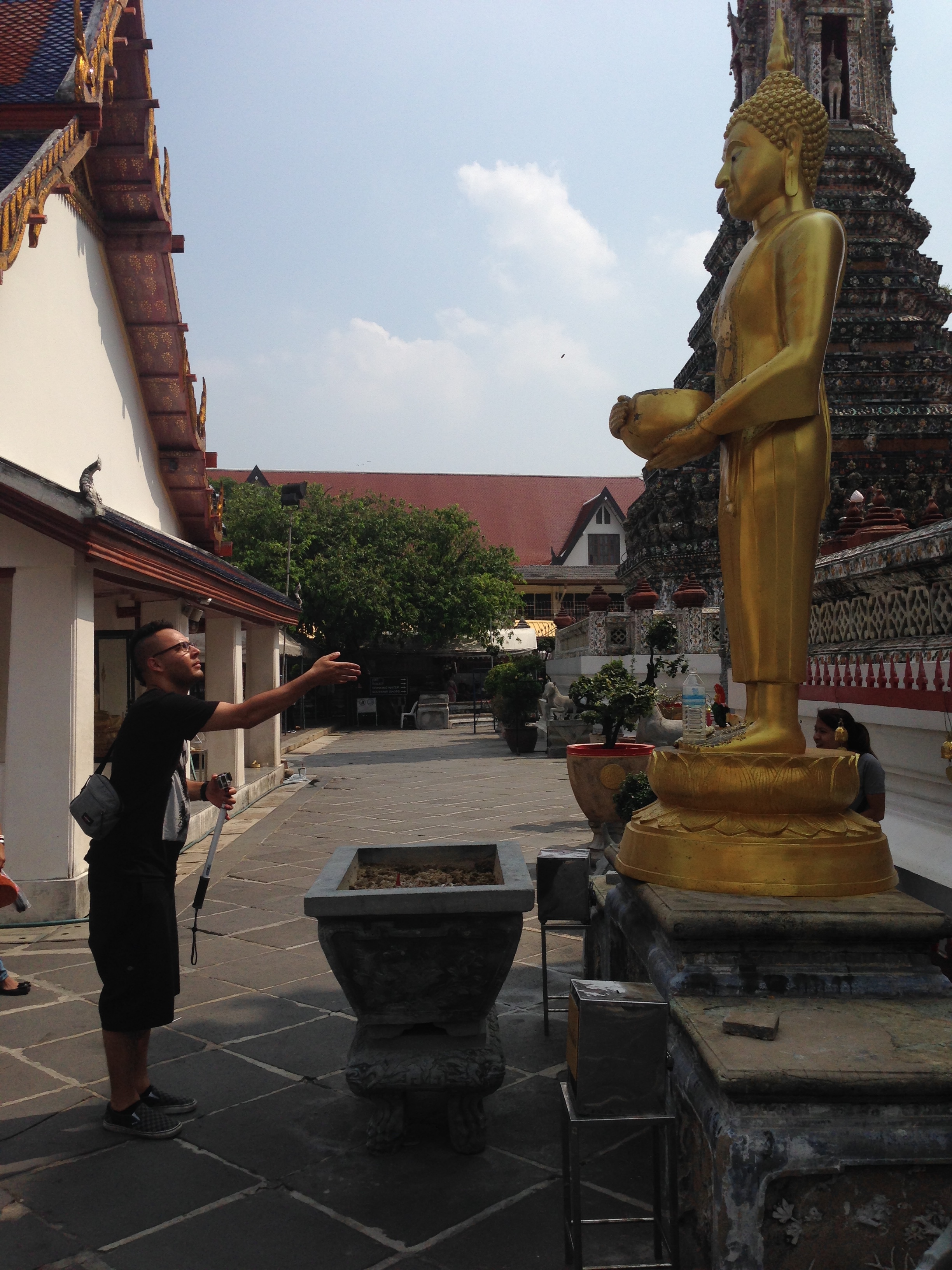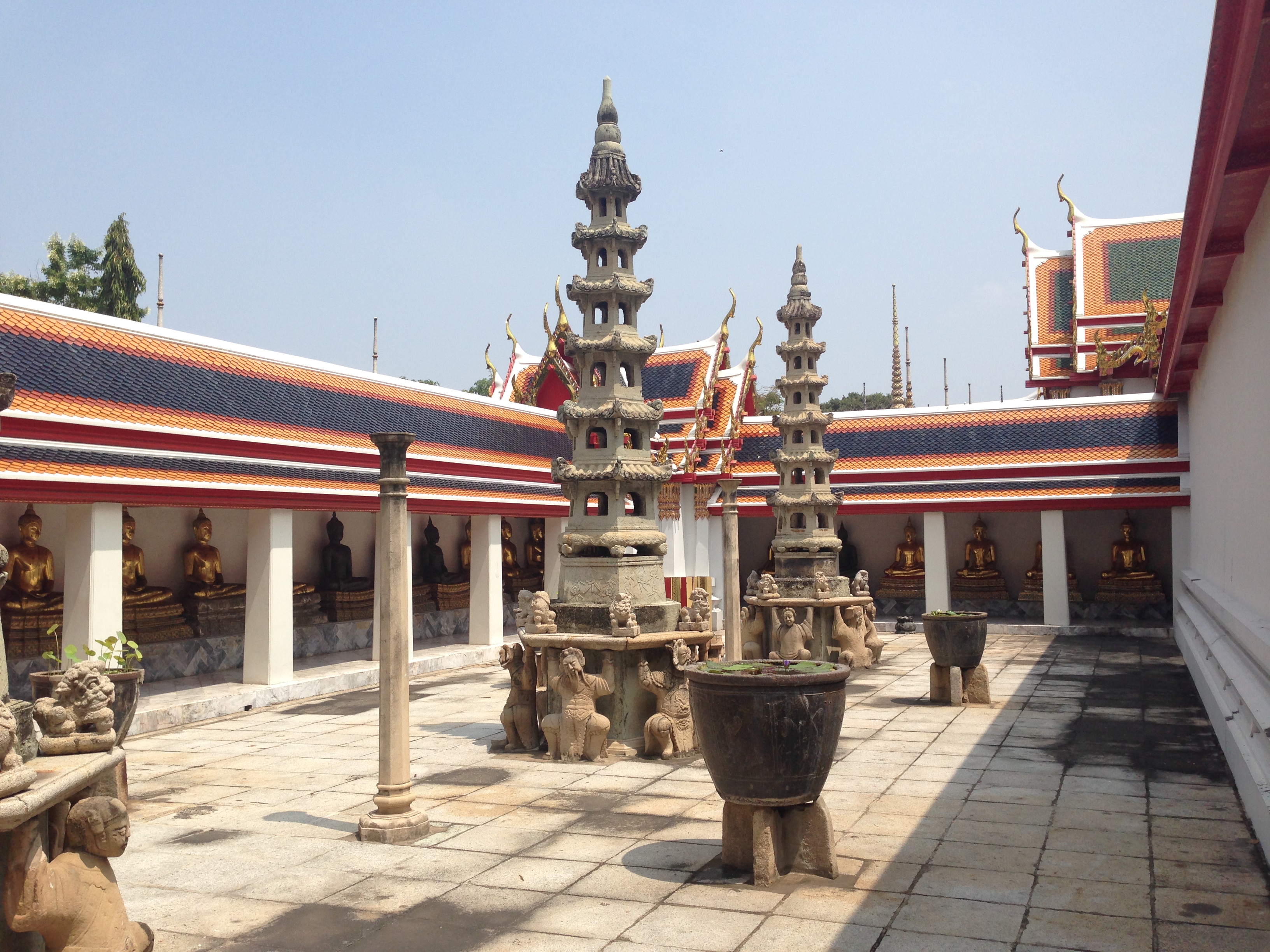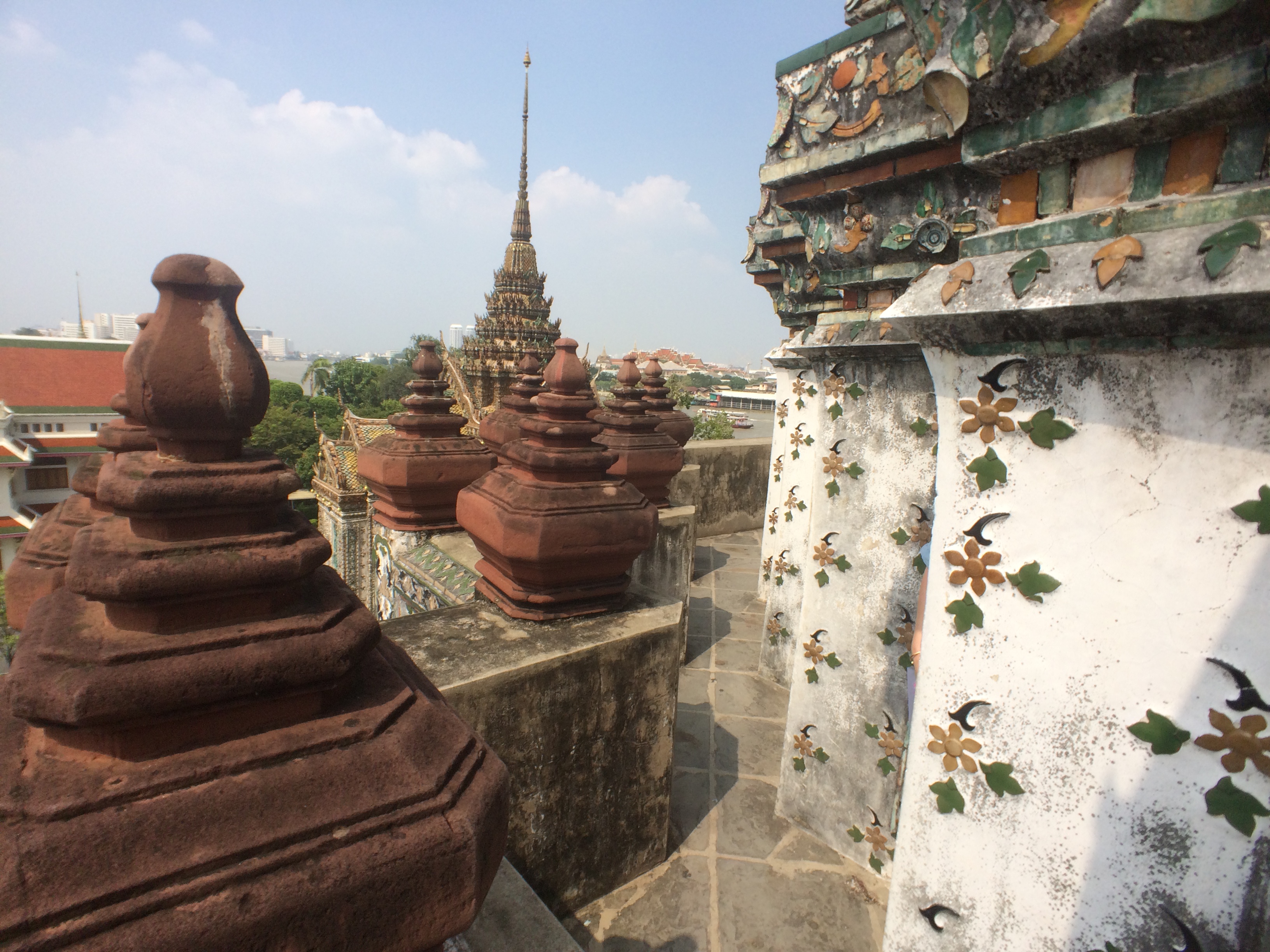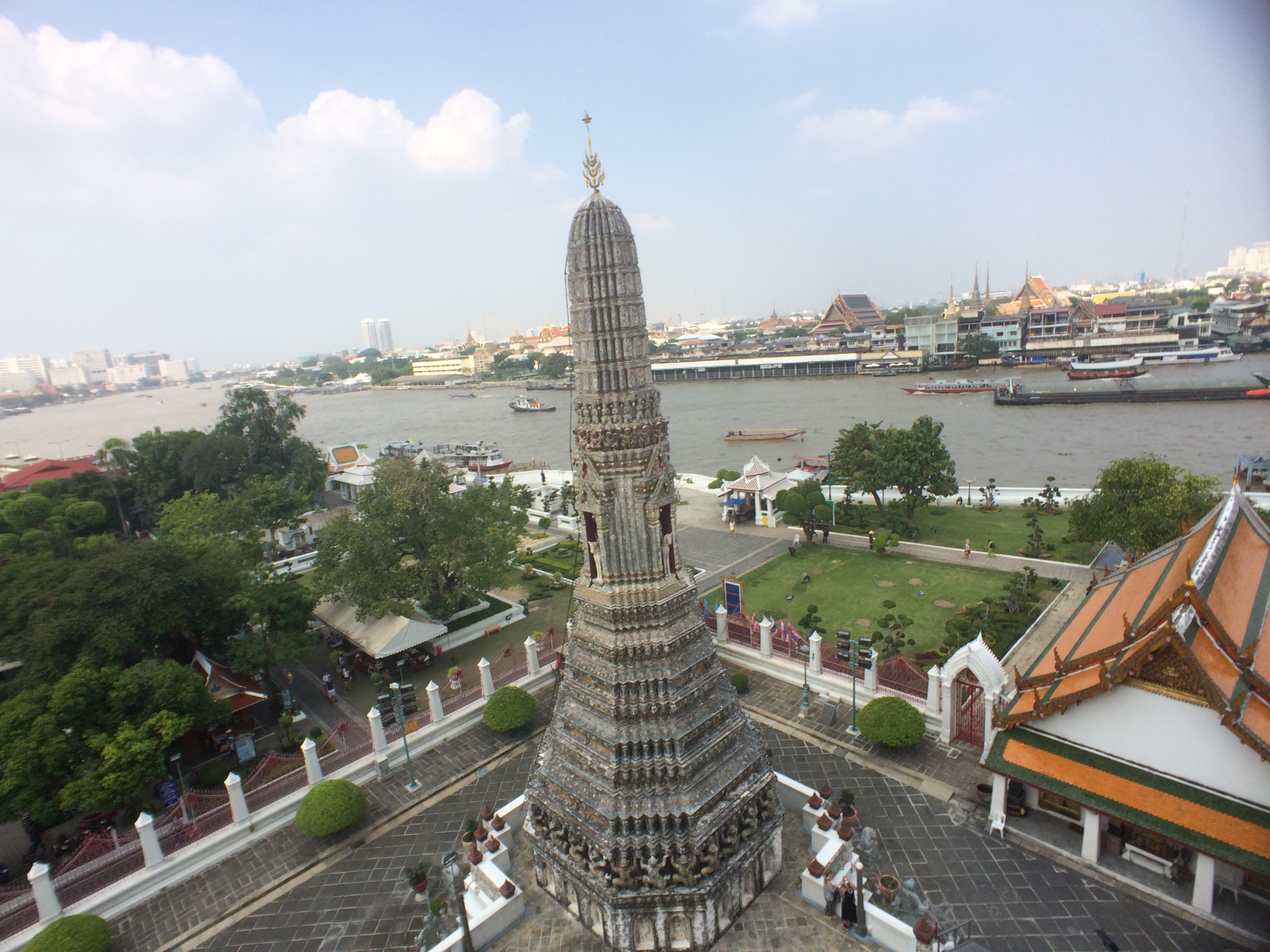 Le Wat Pho est assez impressionnant mais aussi très haut ! Après avoir tenté ( et réussi après quelques tentatives) de lancer une pièce dans le bol du Buddha situé à l’entrée nous commençons l’ascension. On y est jamais allé mais ça nous fait penser aux pyramides du Mexique tellement les marches sont hautes et abruptes (LiLi profite de la visite pour jouer à cache-cache).