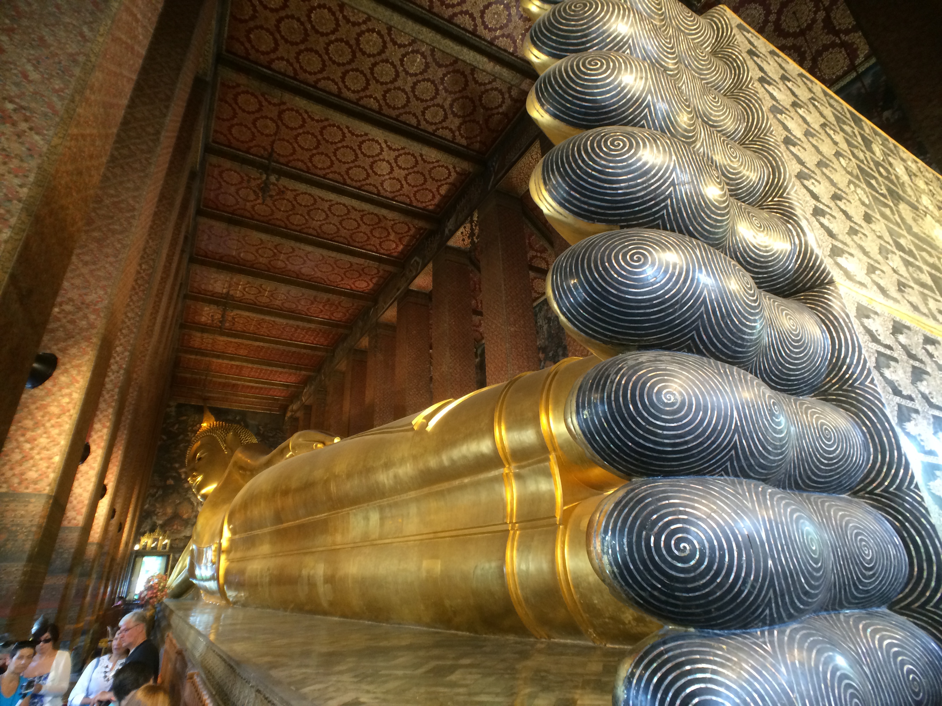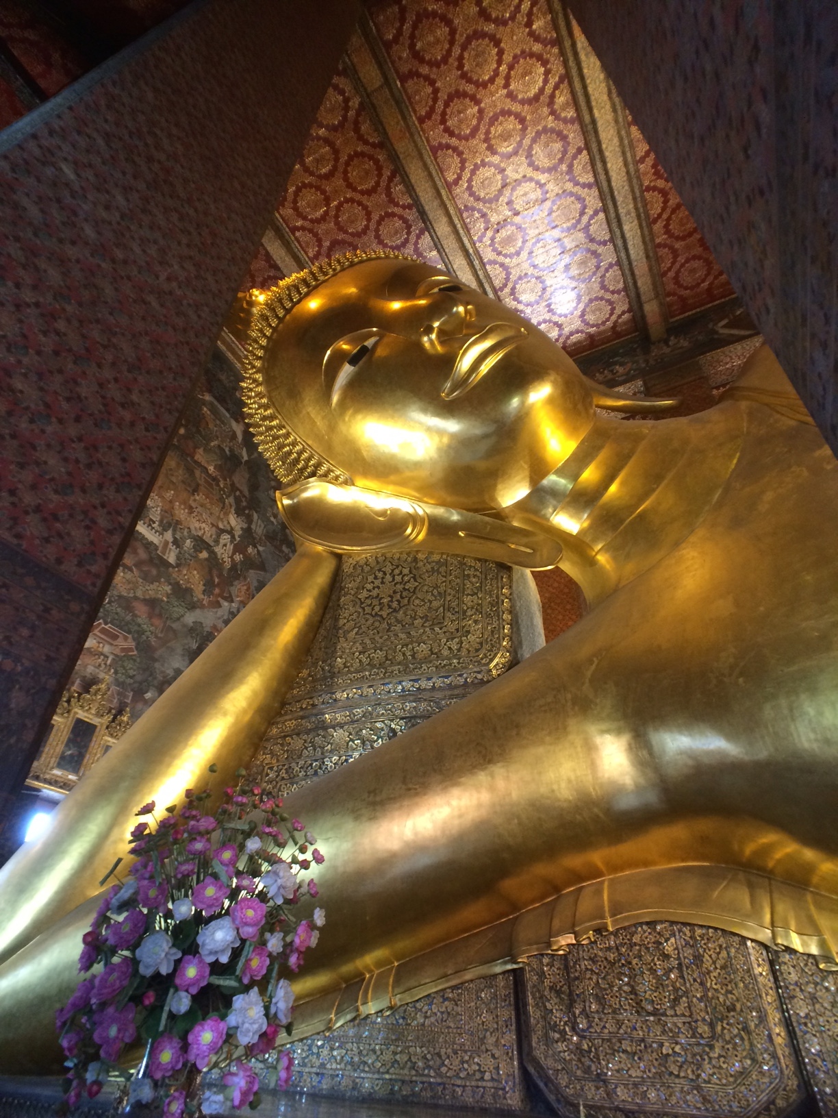 L’intérieur est très joli et les bâtiments nous rappellent ceux du Grand palais visité 3 ans plus tôt. Mais nous sommes surtout impressionnés par la taille du Buddha couché ! Il est immense et paraît même à l’étroit dans son bâtiment. Et entièrement doré ! On vous laisse voir en images et en vidéo :