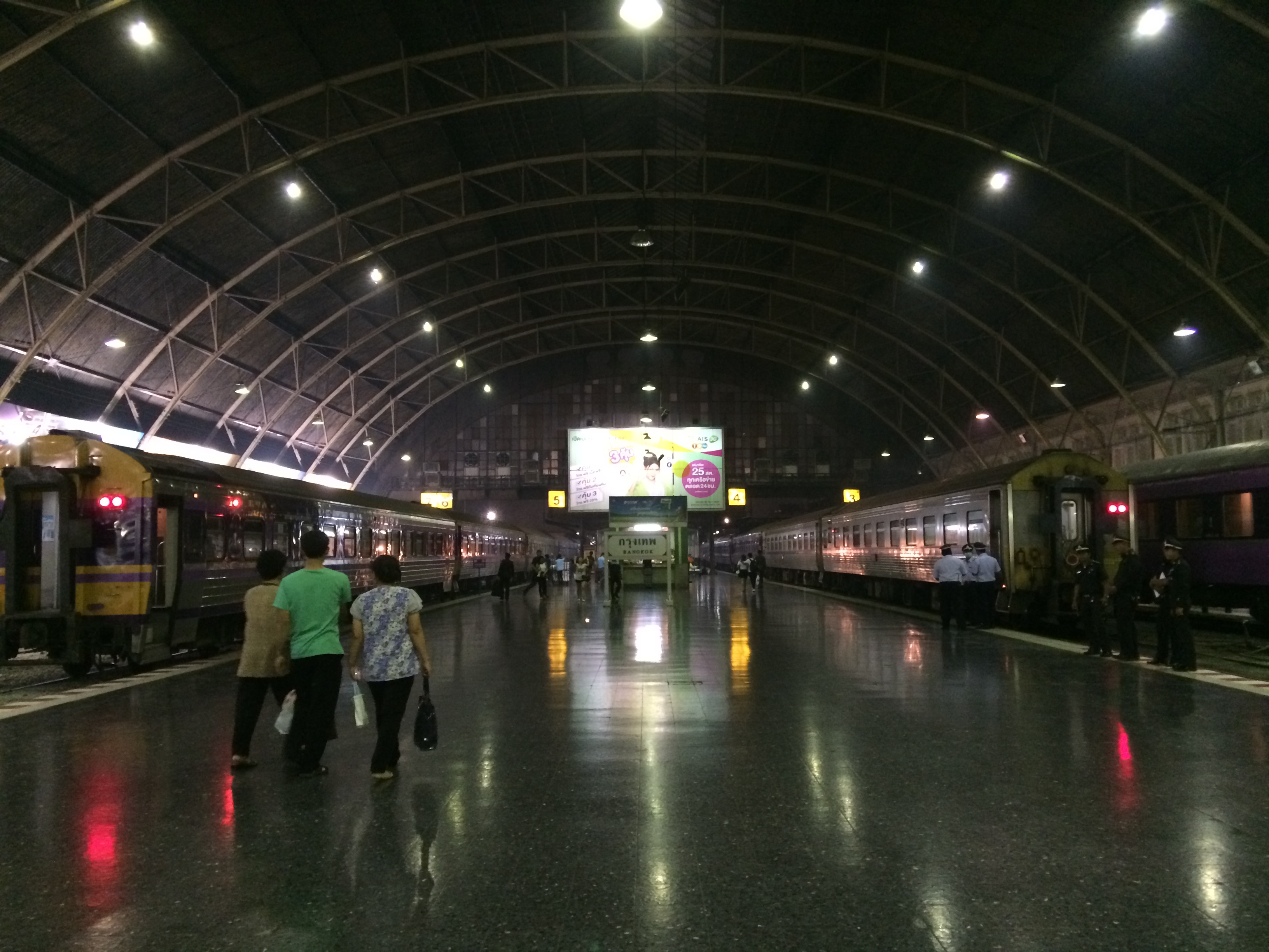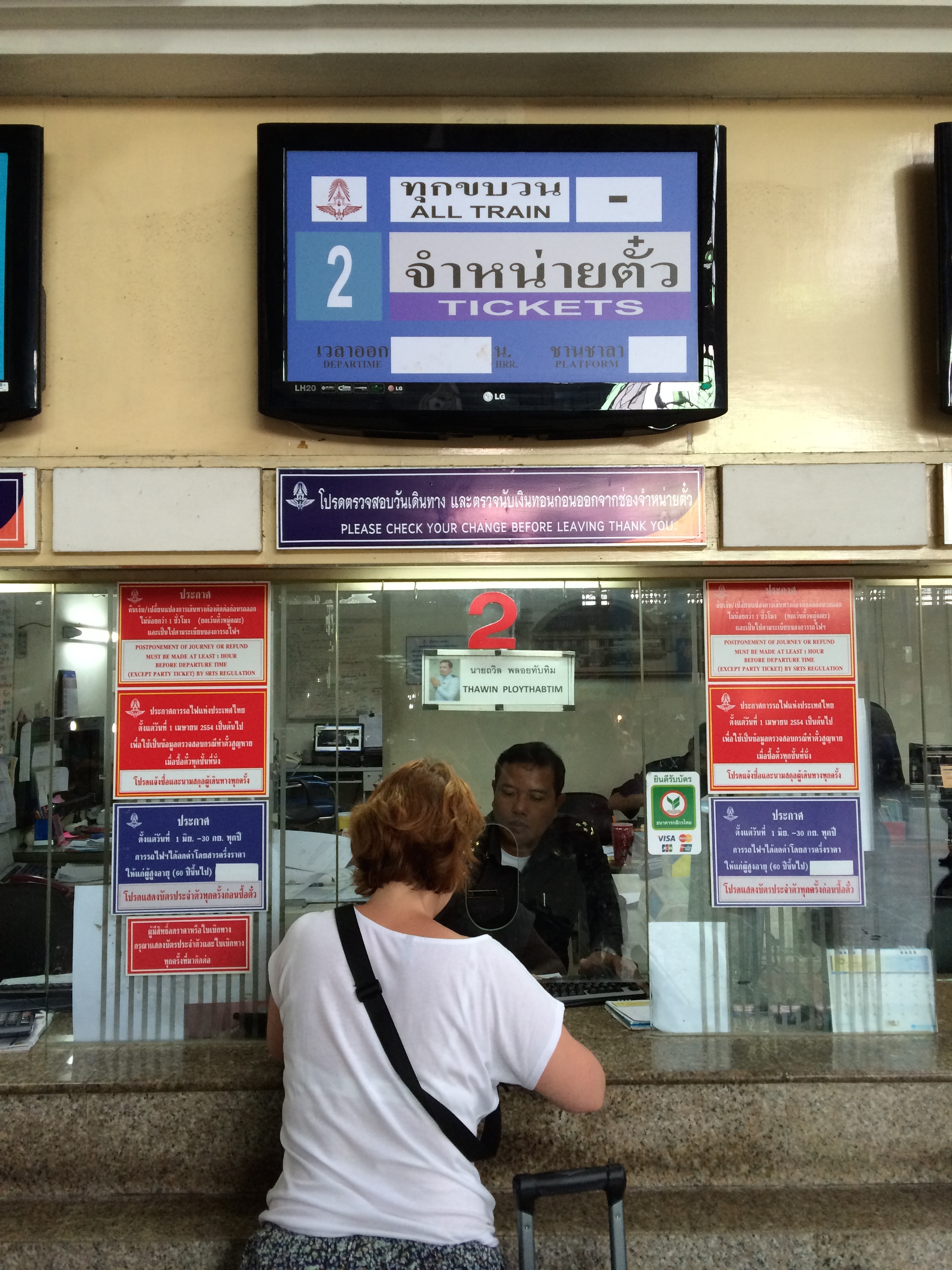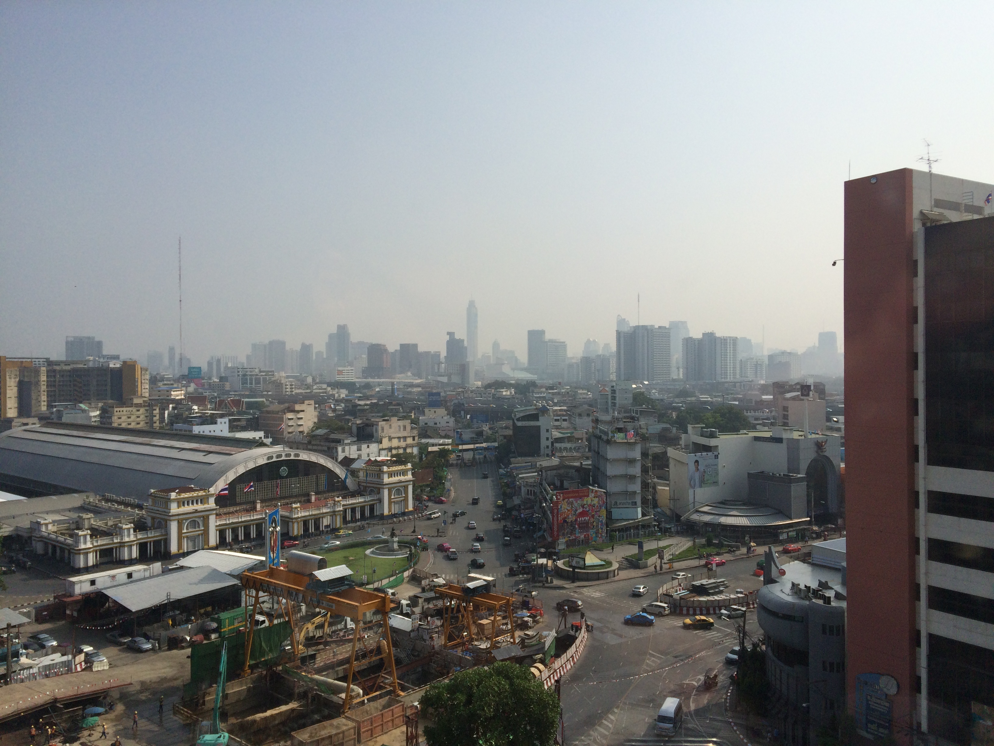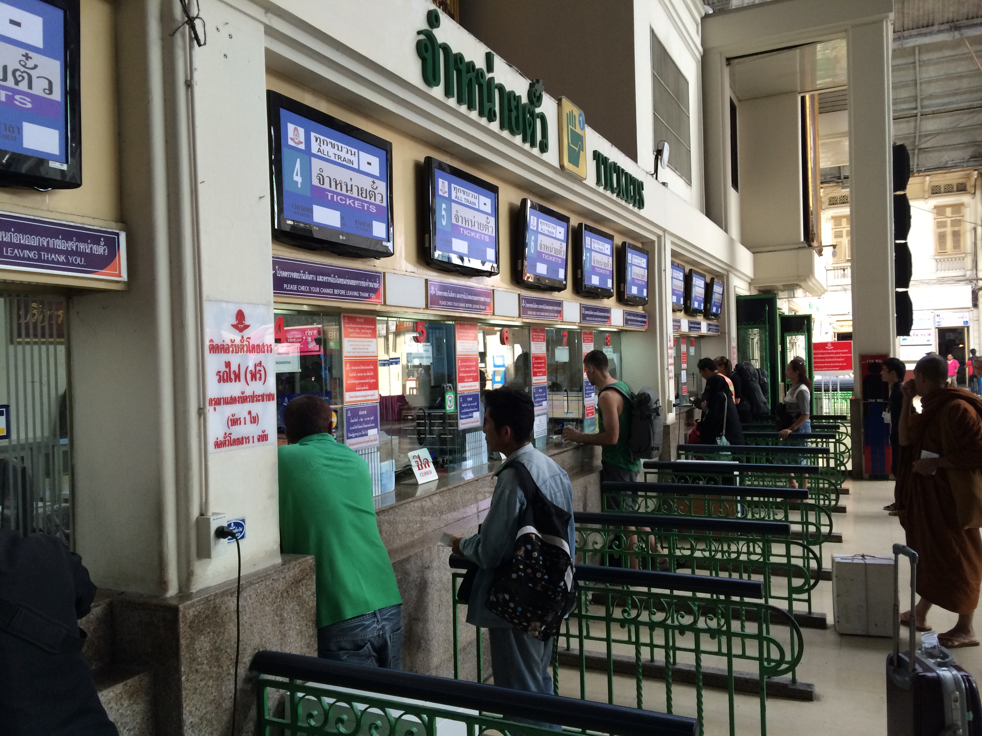Ah qu’on est bien à Bangkok ! Nous n’étions pas encore passé par cet aéroport là mais nous nous débrouillons pour prendre un bus puis le métro pour rejoindre la gare centrale à côté de laquelle se trouve notre hôtel. L’objectif est idéalement de prendre un train de nuit le lendemain soir s’il reste des places disponibles. Nous passons par la gare avant de déposer nos affaires à l’hôtel.