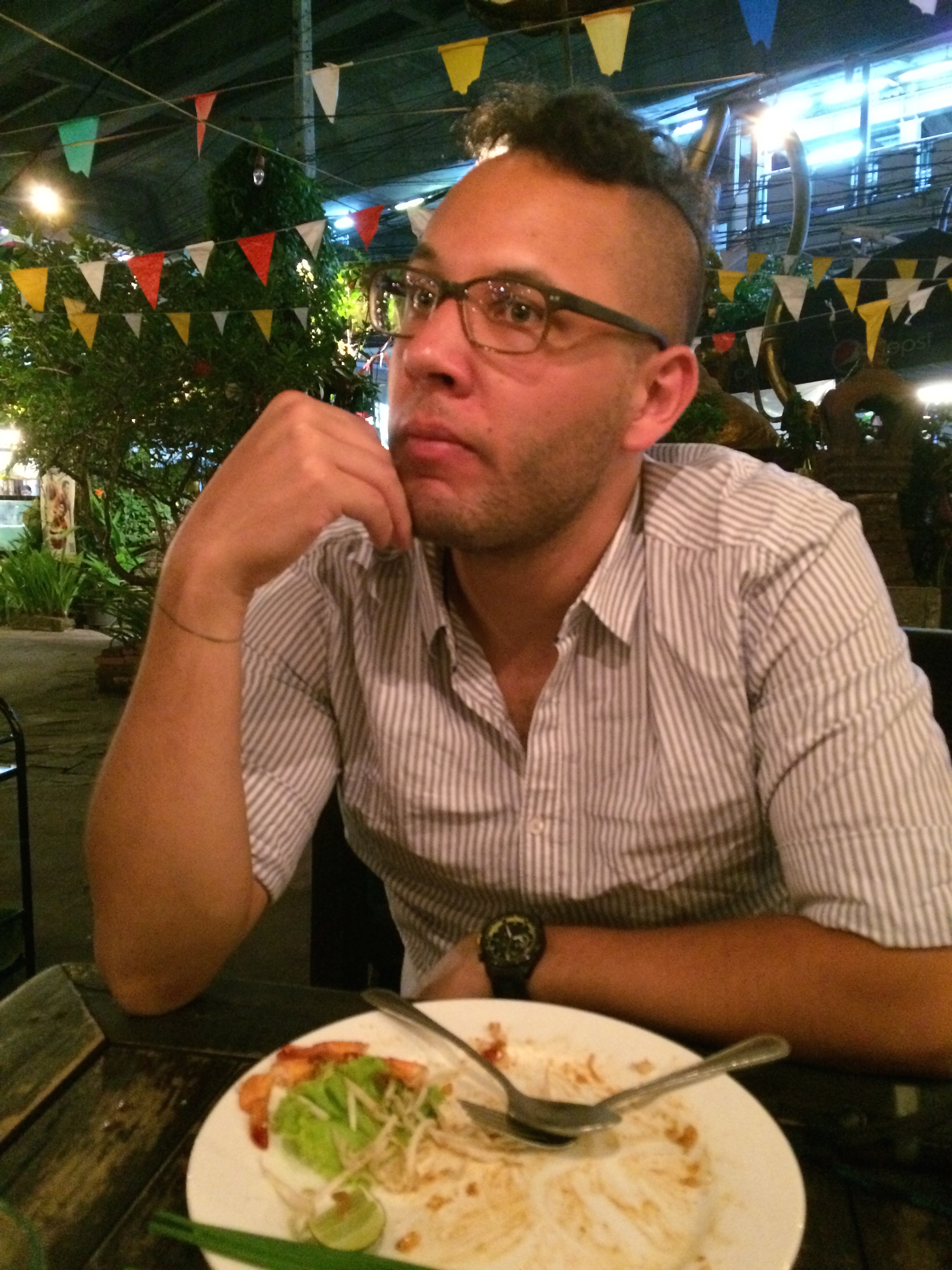 En fin de journée nous décidons d’aller dîner et de trouver l’hôtel Mariott en haut duquel on peut boire un verre à priori. A peine sorti du métro nous trouvons un charmant restaurant de rue en plein air dans lequel nous dégustons bien évidemment 2 Pad thaï ! Nous nous régalons, ah qu’on est bien en Thaïlande 😉