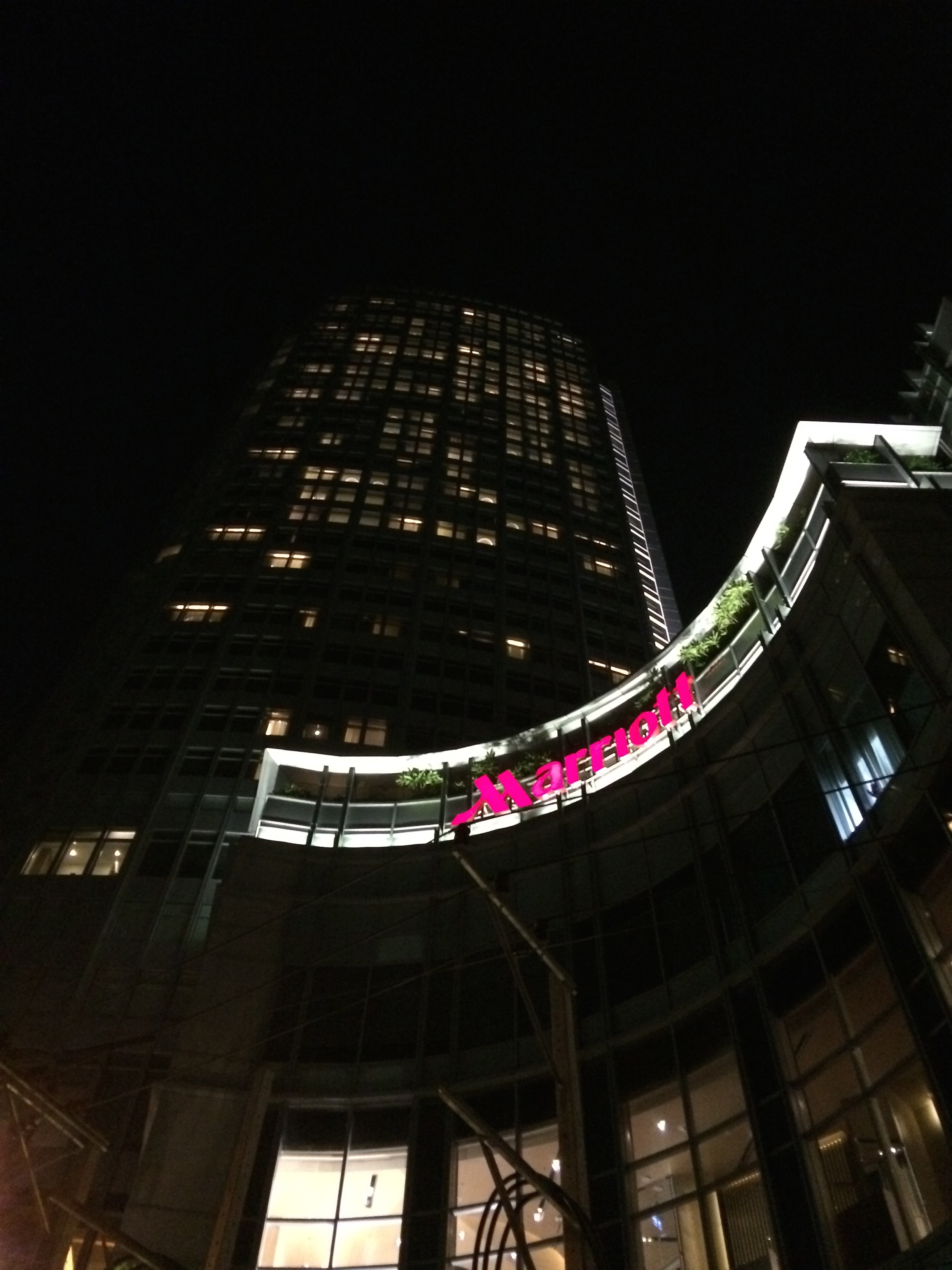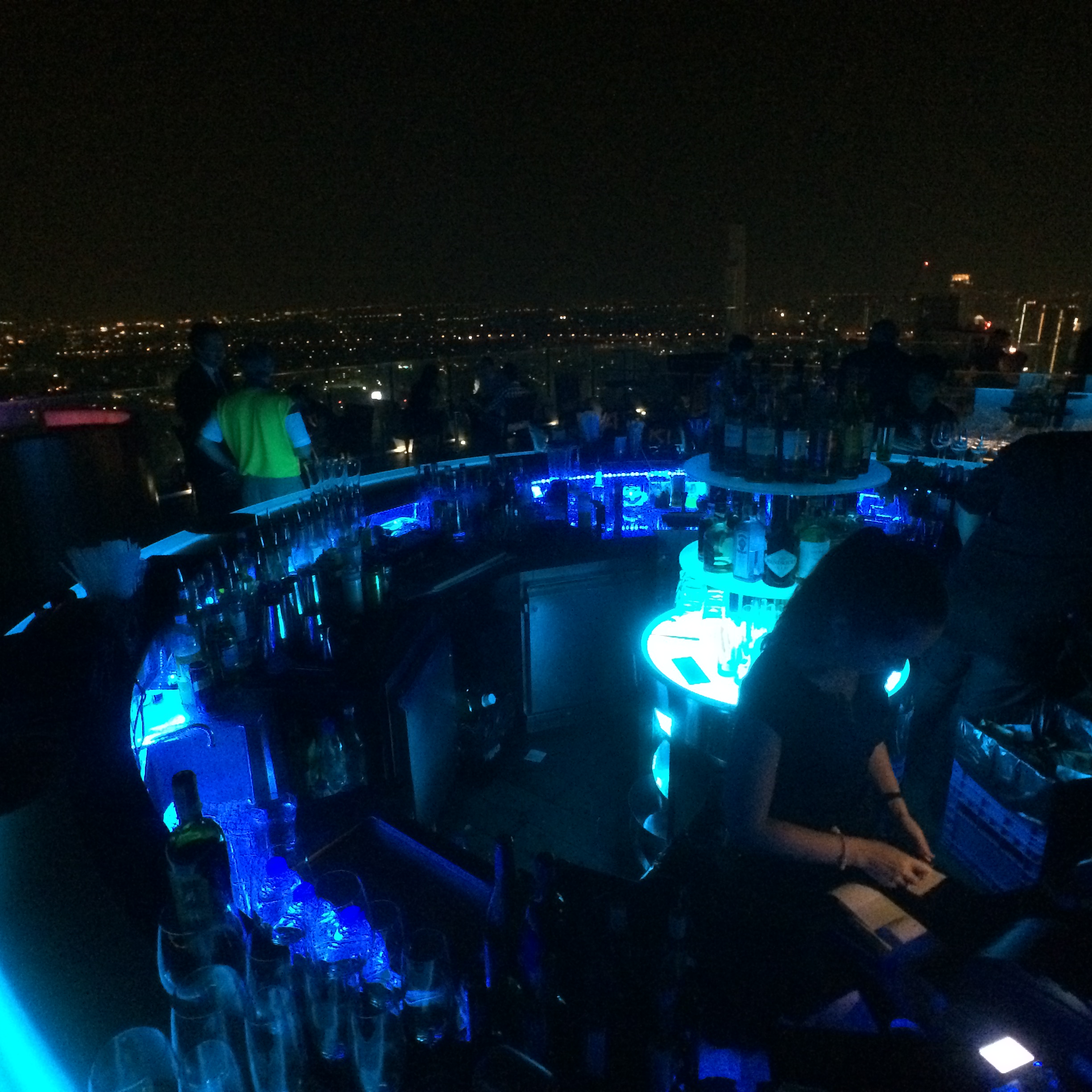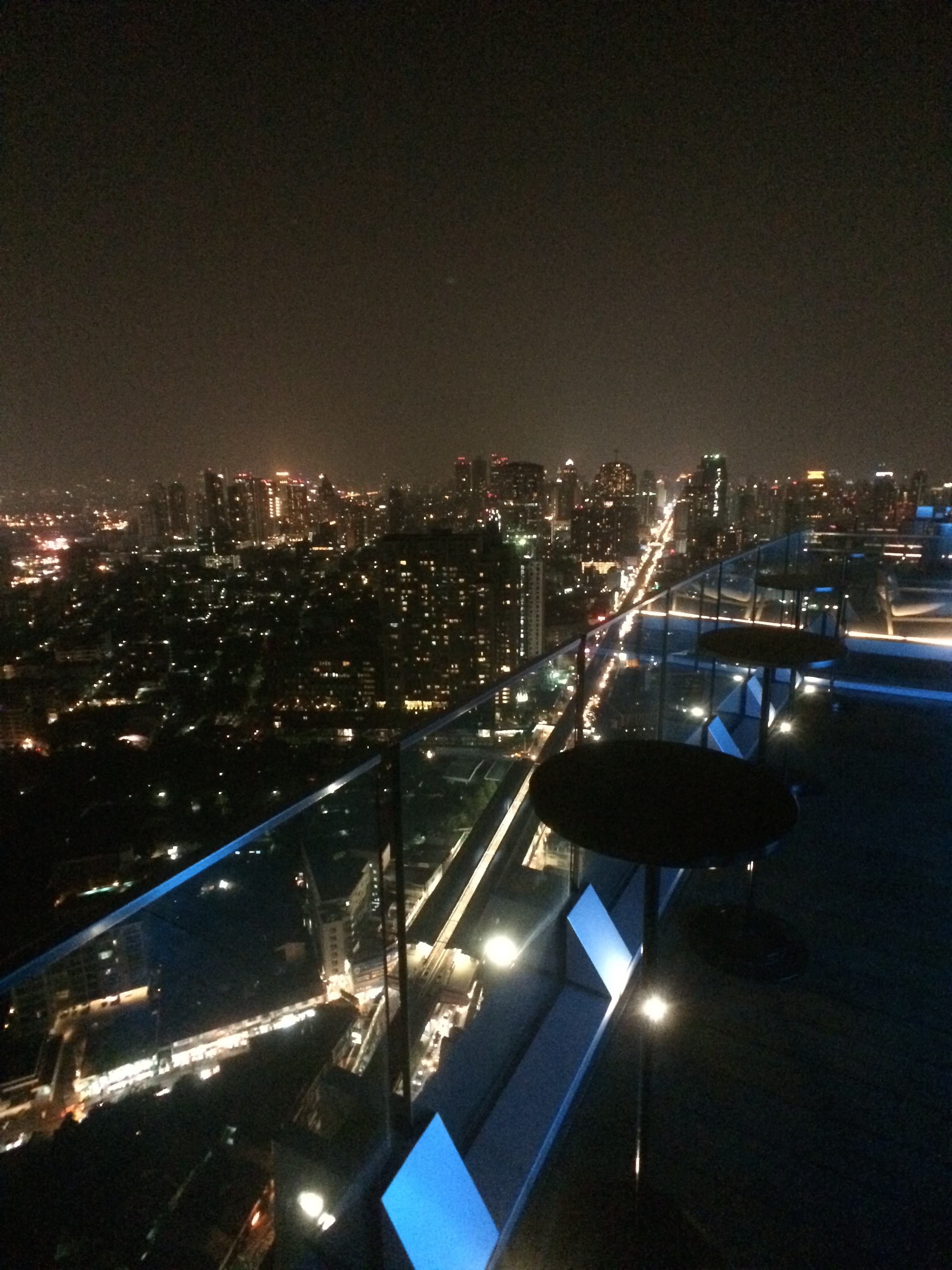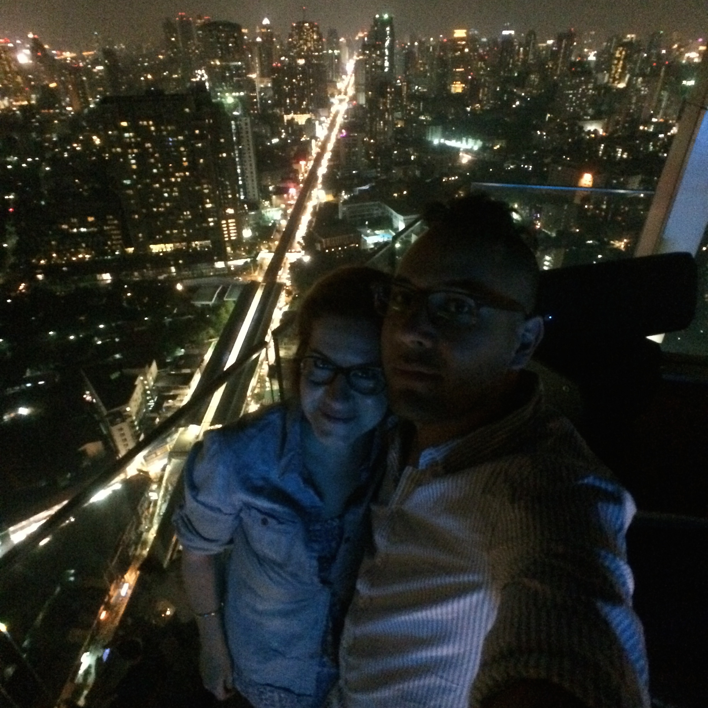 Puis nous partons à la recherche du Mariott pas si simple à trouver que ça mais nous y arrivons tout de même. Nous empruntons un ascenseur, puis un deuxième pour atteindre l’avant-dernier étage de l’hôtel. Le dernier se fait par un escalier et nous nous retrouvons sur le toit de l’hôtel ! Un bar et une grande terrasse ont été aménagés et on a une vue imprenable sur tout Bangkok. JMi a vraiment eu une superbe idée ! Ce soir c’est fête, Mojito pour LiLi et coupe de champagne pour JMi. Nous dégustons nos boissons, savourons la vue, et en prenons plein les yeux.