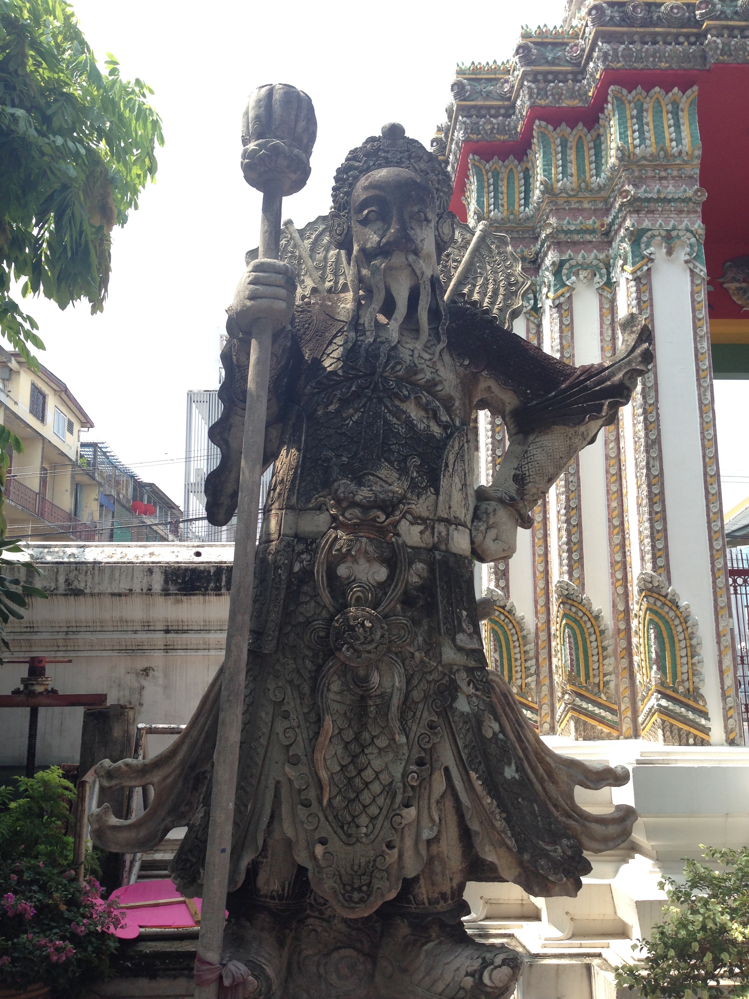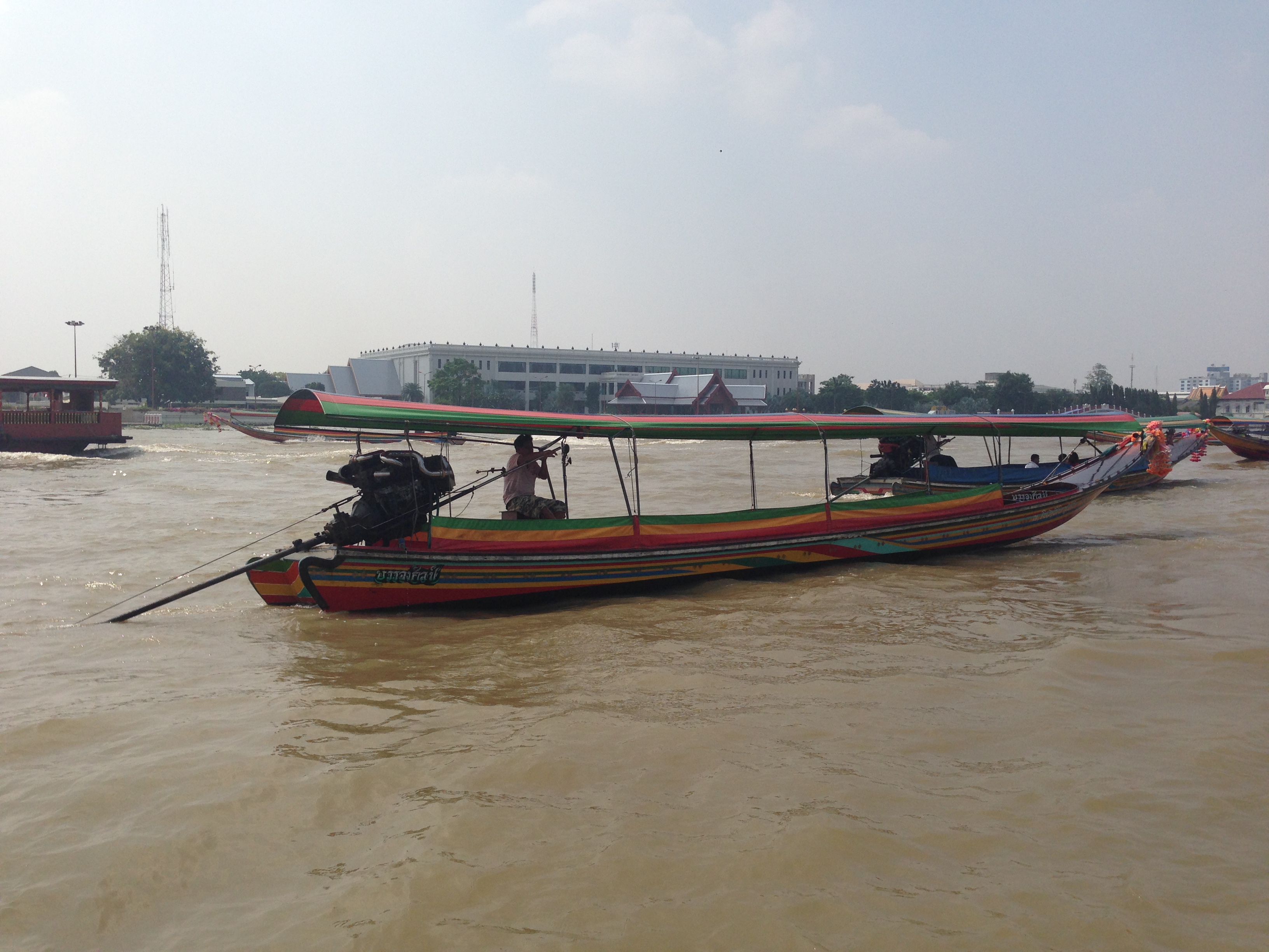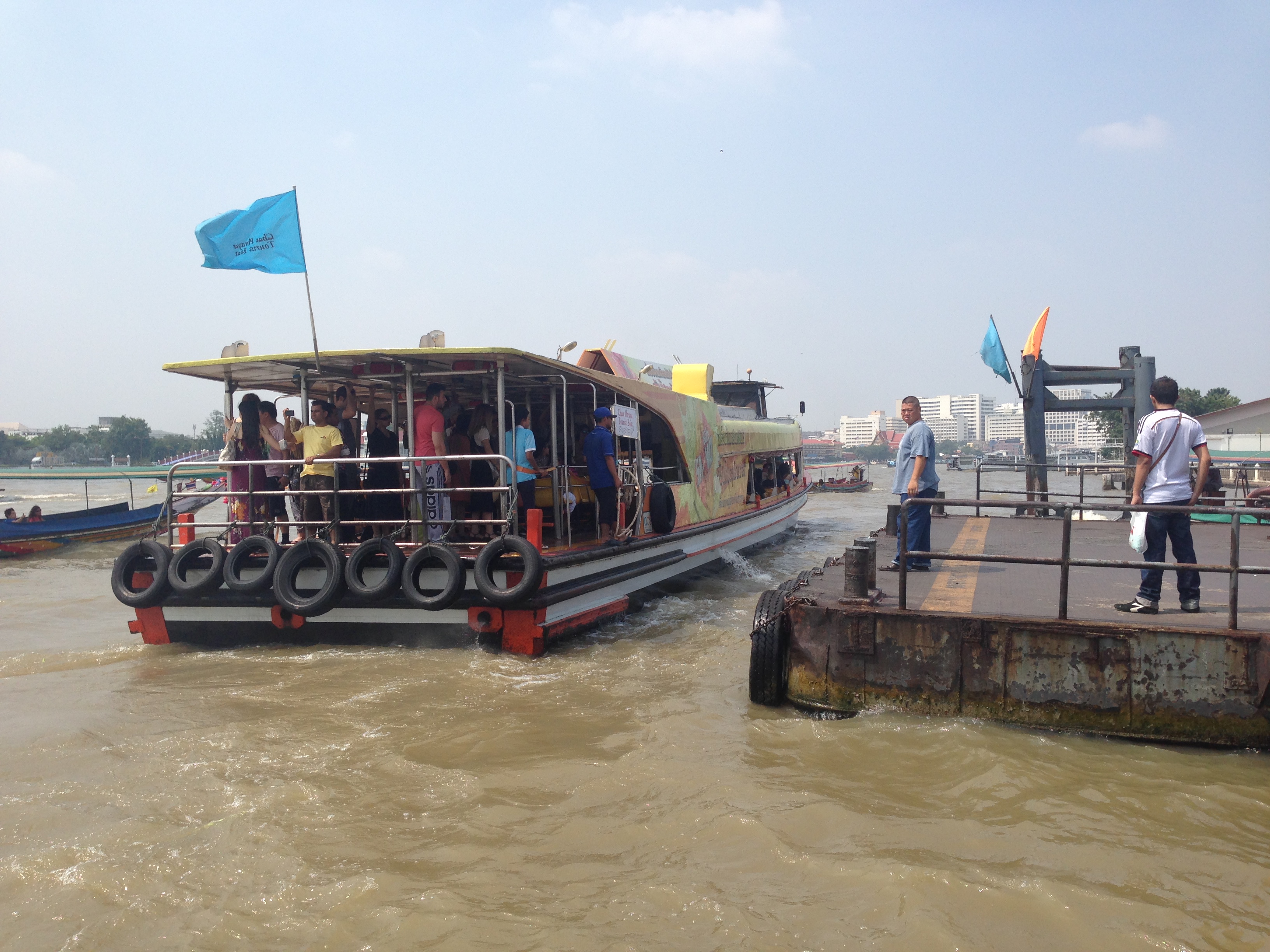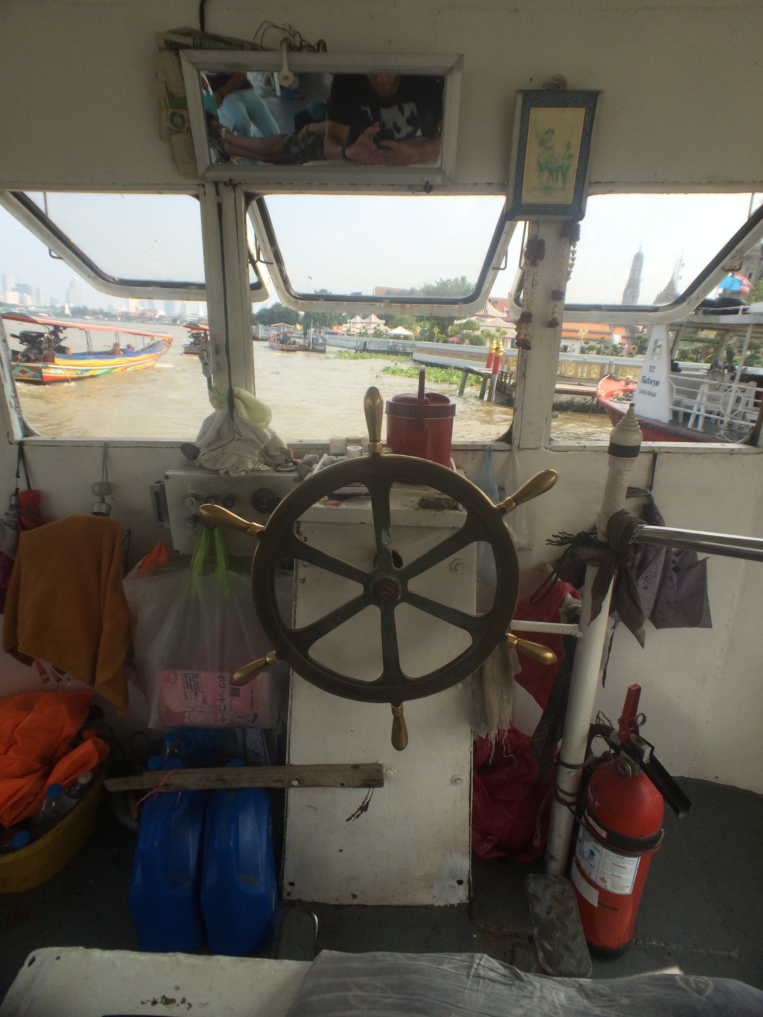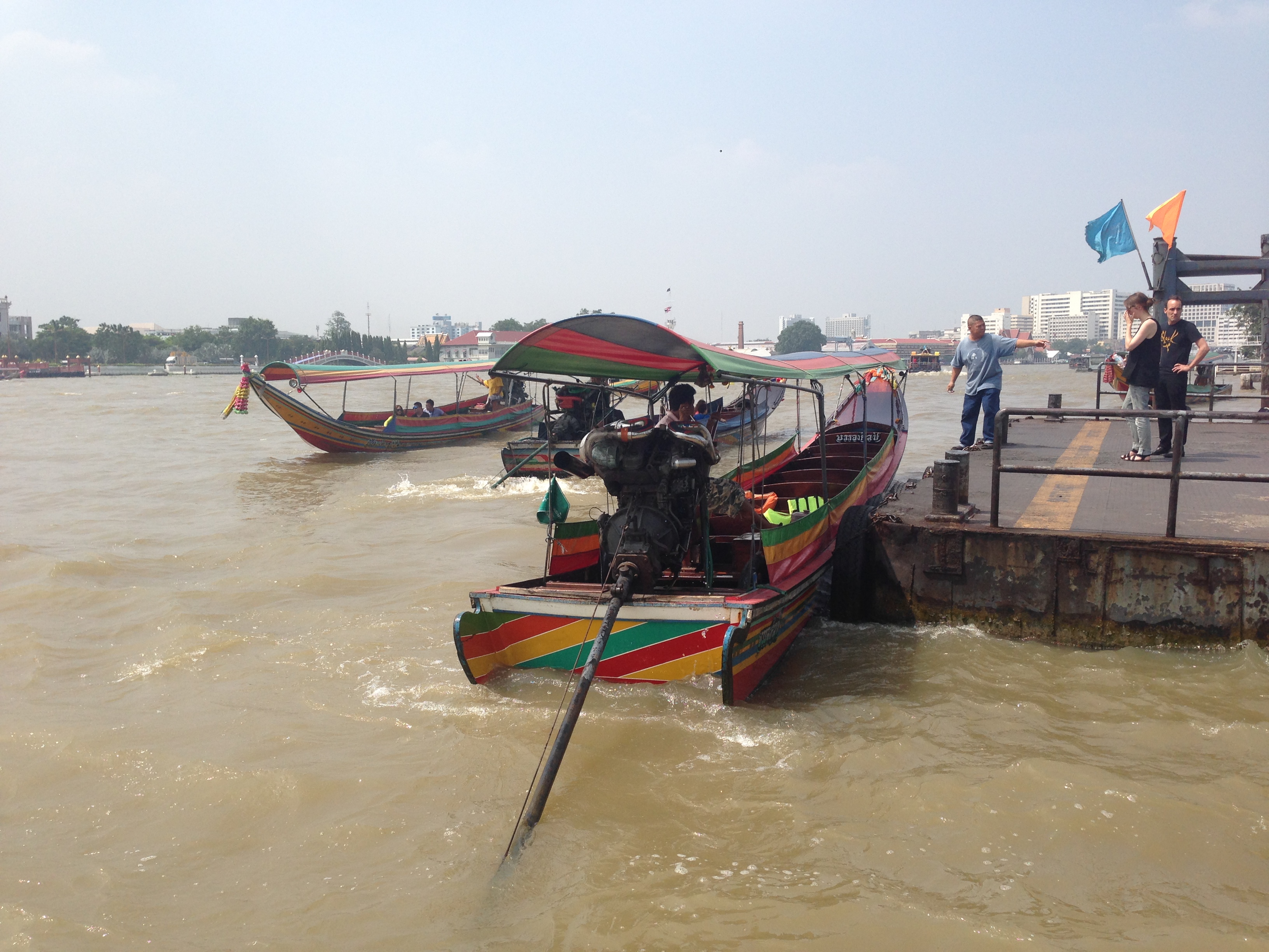 Mais au final il nous dépose devant un tailleur de costumes où il a certainement une commission et nous demande d’aller faire un tour dans la boutique car c’est apparemment bon pour lui et pour nous « good for for you and good for me » nous dit-il en souriant… Nous ne voulons pas le contrarier et faisons un rapide tour dans la boutique avant d’en ressortir (les mains vides). Il nous conduit donc à l’embarcadère des bateaux bus car apparemment le Wat Pho est trop loin pour lui en tuk tuk. Et là mauvaise surprise c’est en fait un embarcadère de bateaux privés qui proposent des croisières privatives beaucoup trop chères pour nous qui souhaitons simplement aller au Wat Pho et au Wat Arun sur la rive d’en face…. Nous repartons donc à pieds un peu dépités de s’être fait avoir comme ça en se demandant où nous allons bien pouvoir trouver l’embarcadère des bateaux bus… Finalement nous retombons sur notre chauffeur qui semble désolé et nous emmène finalement à destination pour quelques bahts de plus (bien négociés).