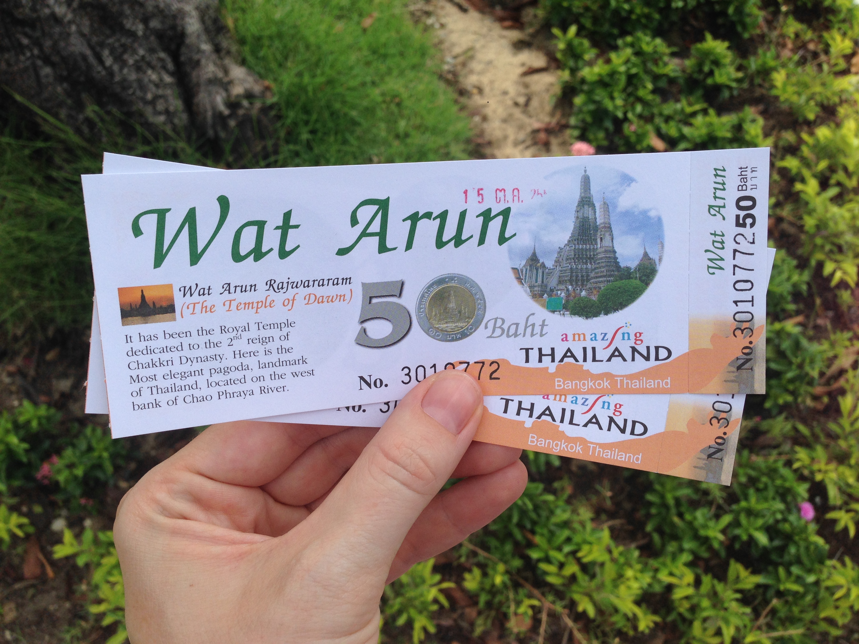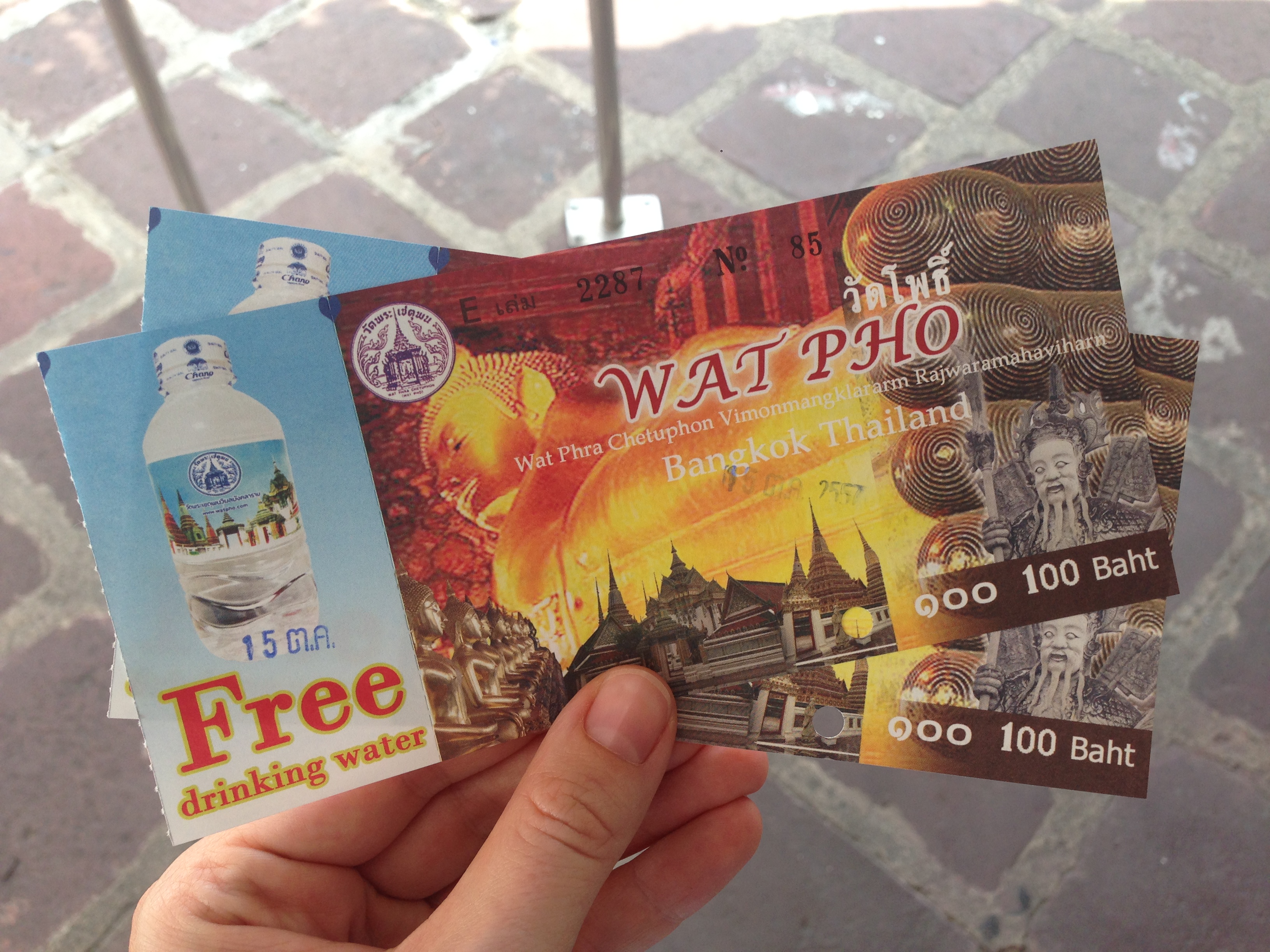 Arrivés au Wat Pho un chauffeur de tuk tuk nous sort la fameuse histoire du temple fermé pour cérémonie et se propose donc de nous conduire ailleurs moyennant bien sûr une course en tuk tuk payante. Nous refusons gentiment et arrivons devant l’entrée du Wat Pho qui est bien entendu bien ouvert. Nous prenons nos tickets comprenant une bouteille d’eau gratuite et commençons la visite.